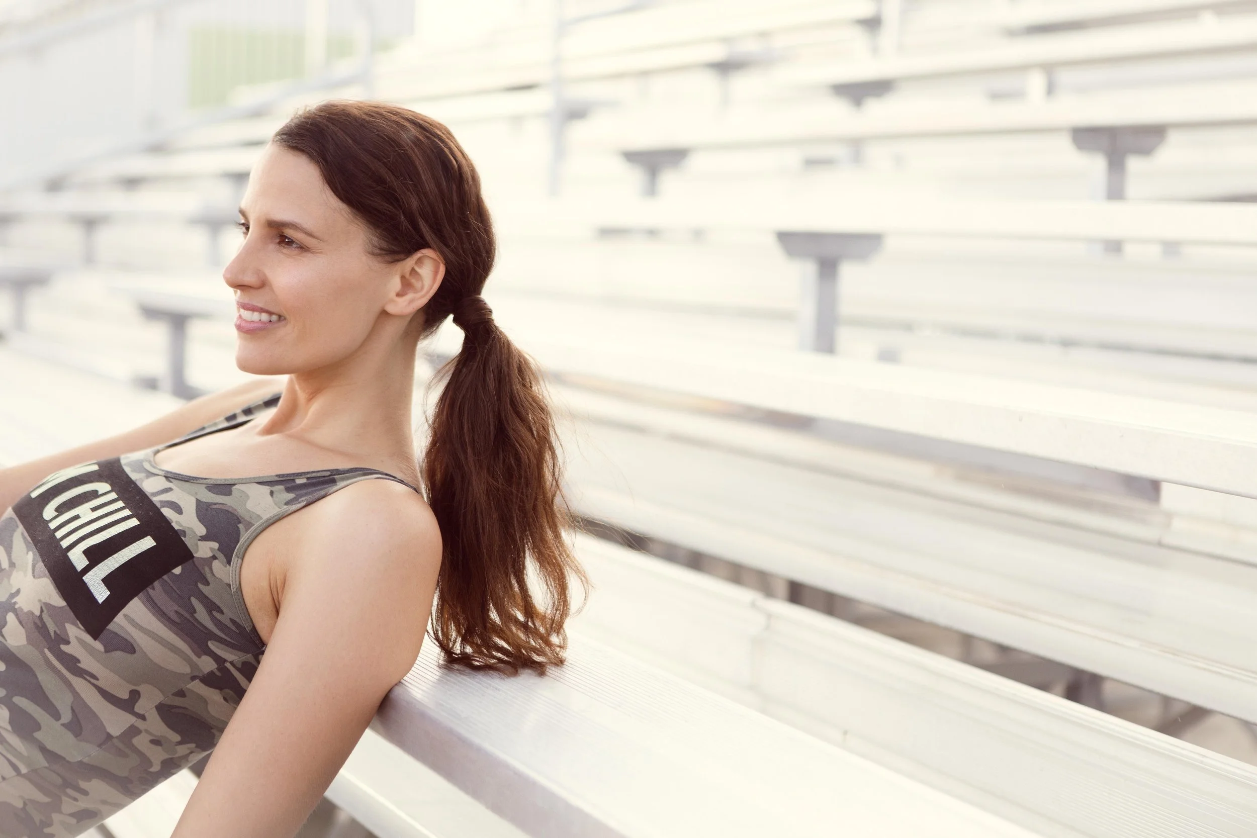A woman with brown hair tied in a ponytail, wearing a camouflage workout top with the word 'CHILL' on it, sitting on white bleachers at an outdoor sports stadium, smiling and relaxing.