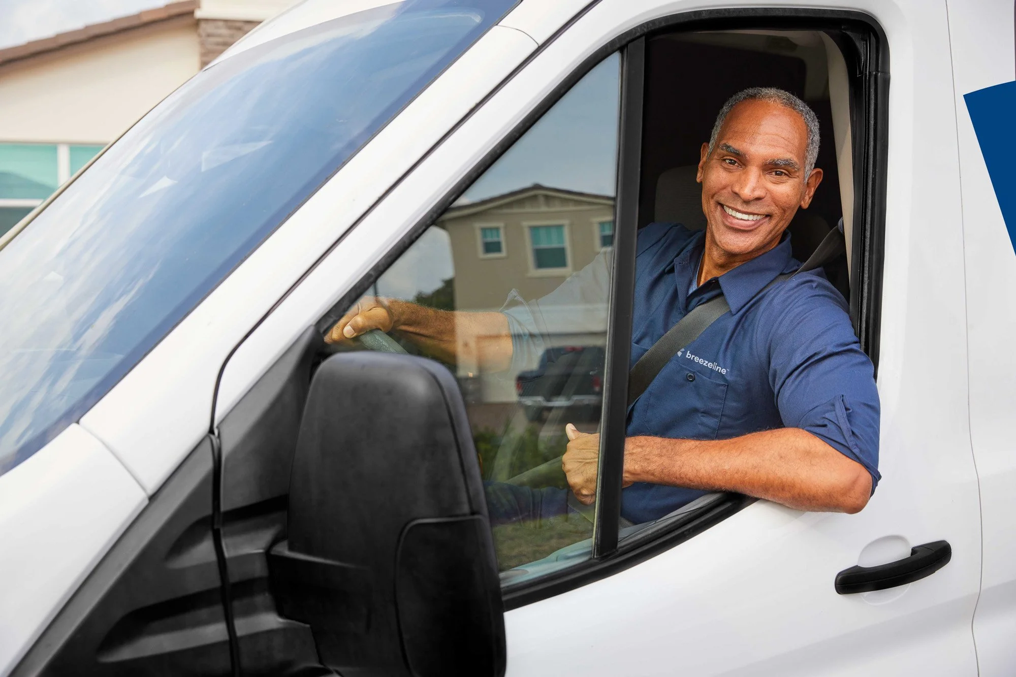 A smiling delivery driver in a blue uniform sitting in the driver's seat of a white delivery van, ready to deliver.
