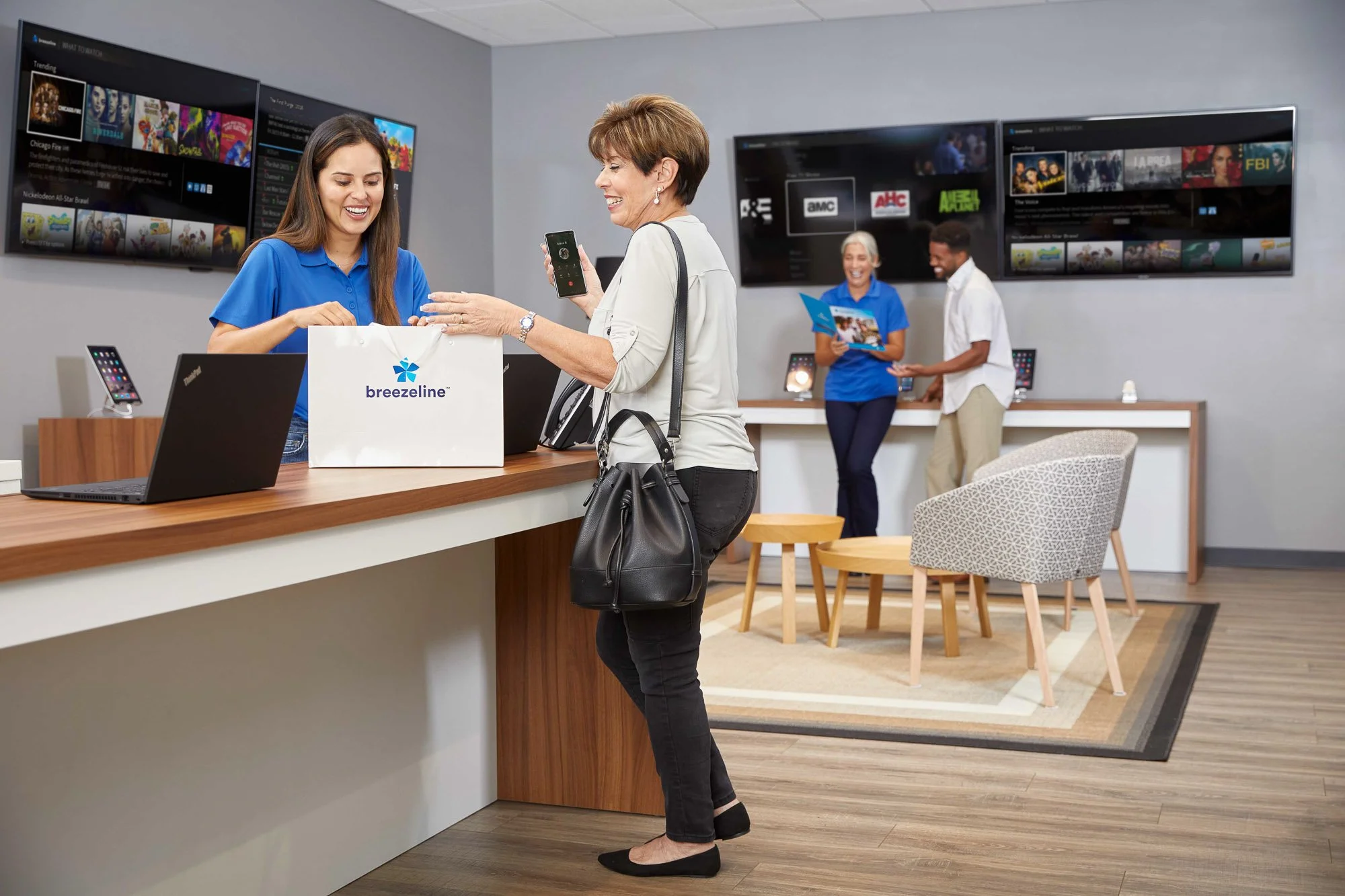 A woman in a white shirt and black pants receiving a shopping bag from a sales associate at a store counter. The woman is holding a smartphone, and there are two other employees behind the counter engaged in conversation. The store has multiple large screens on the wall displaying various media content.