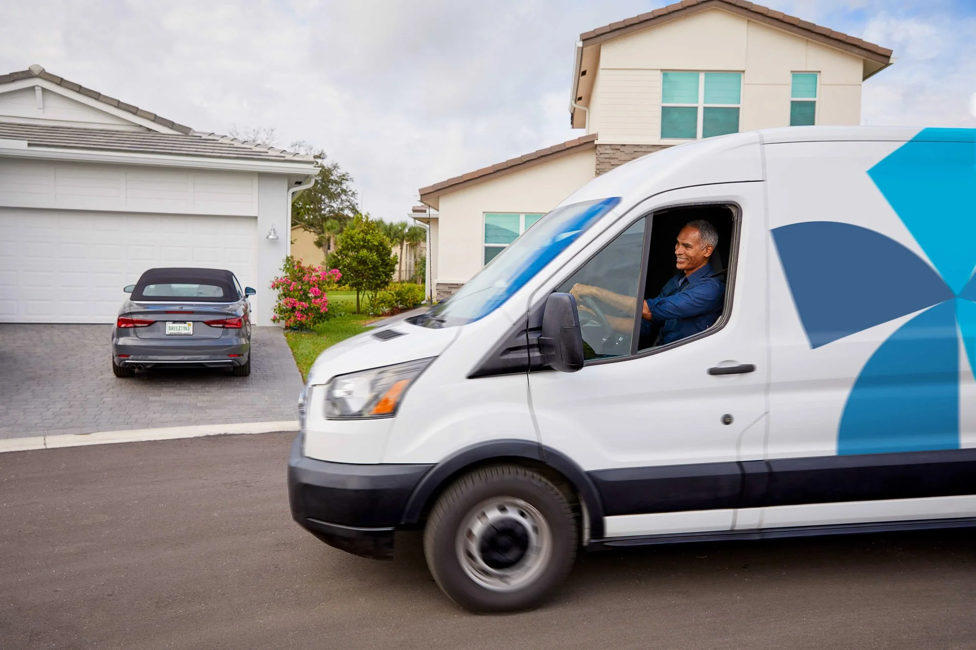 A smiling delivery person driving a white van with blue geometric design past a house with a garage, a black car parked in the driveway, and a garden with pink flowers and green shrubs.
