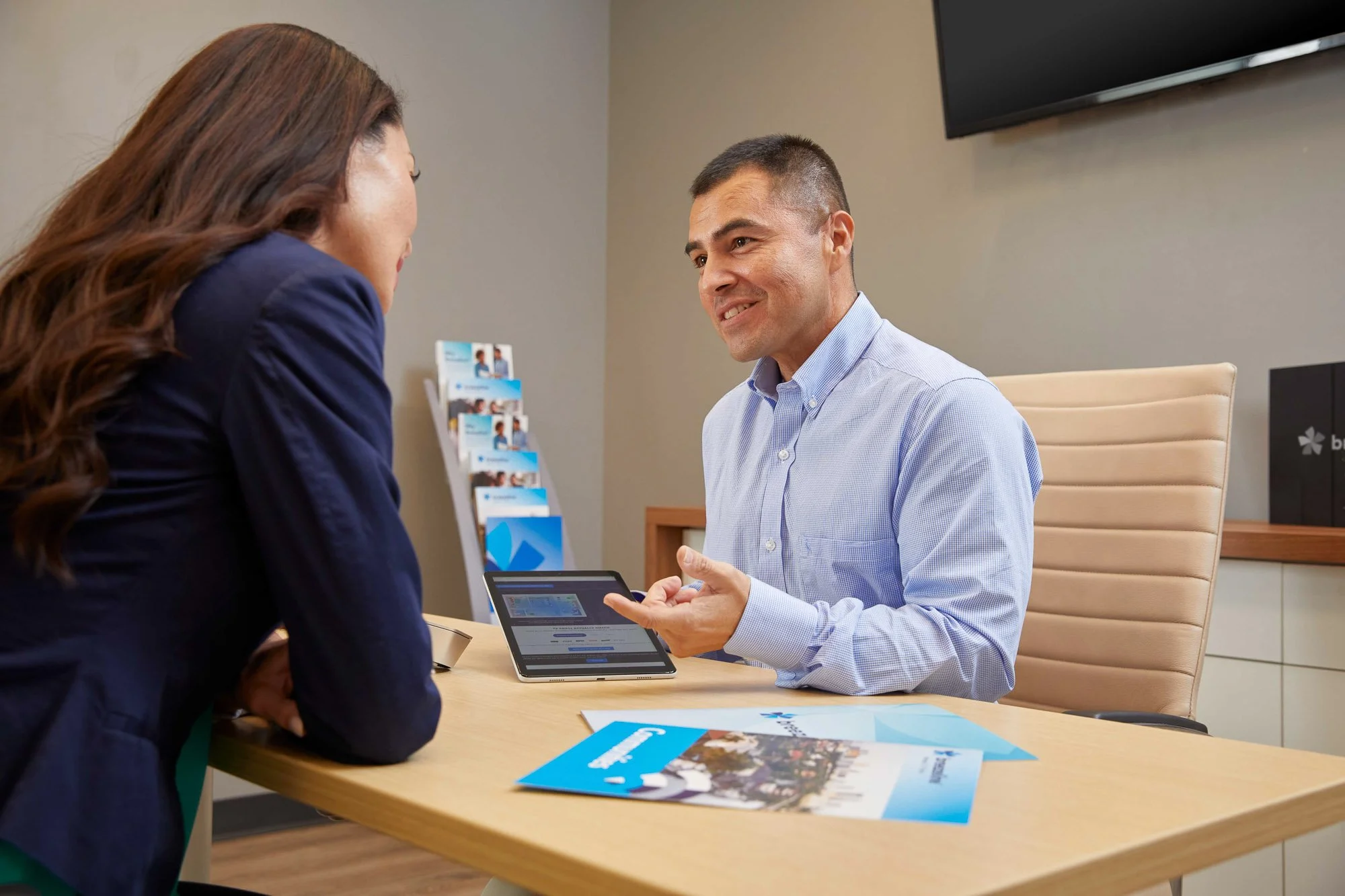 A man in a light blue shirt sits at a desk, smiling and engaging in conversation with a woman in a dark blue blazer. The desk has a brochure and a tablet, with more brochures on a stand behind. The setting appears to be a professional office or reception area.