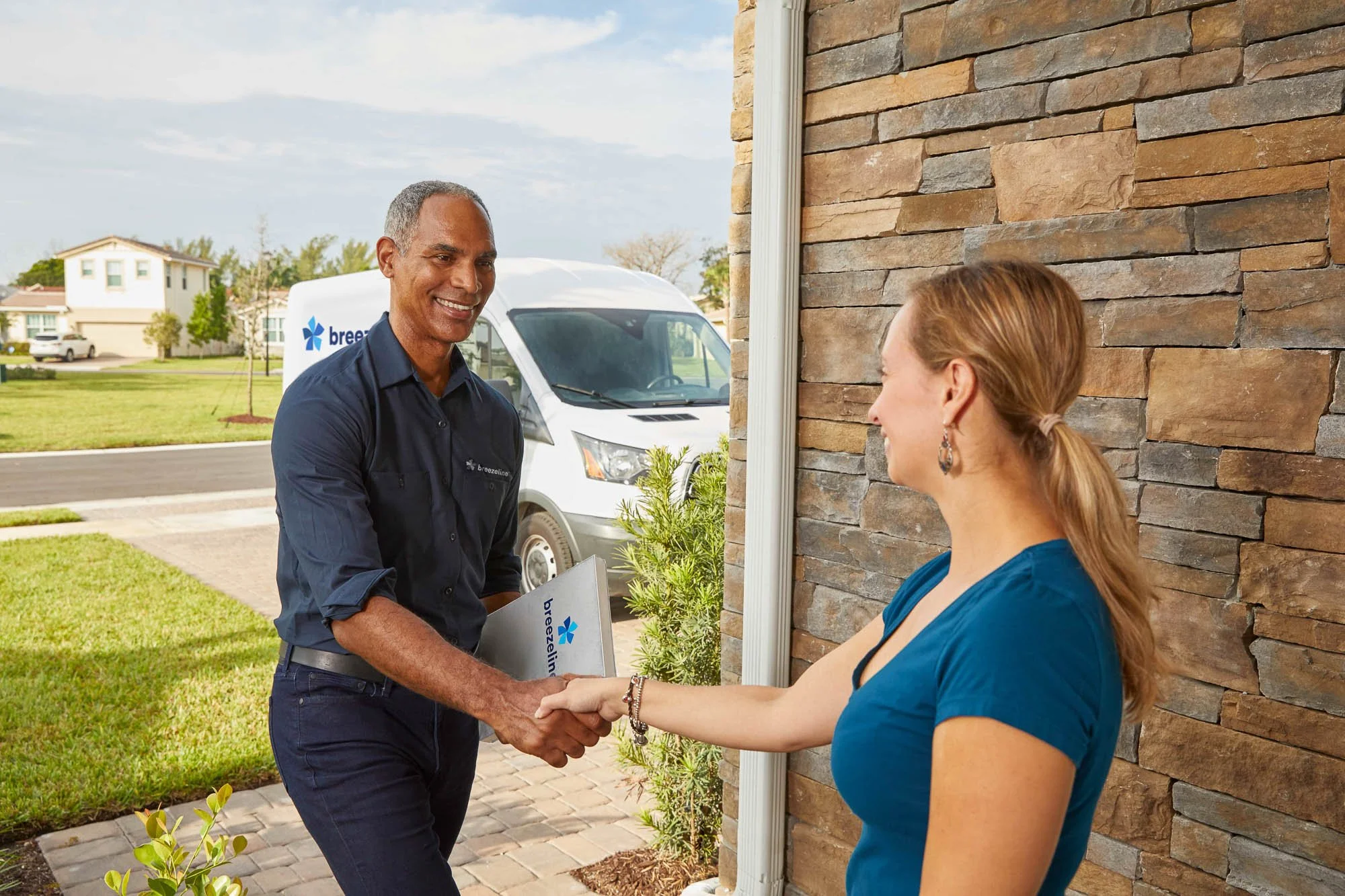 A man in a navy blue shirt shaking hands with a woman in a blue shirt outside a house, with a delivery van in the background.