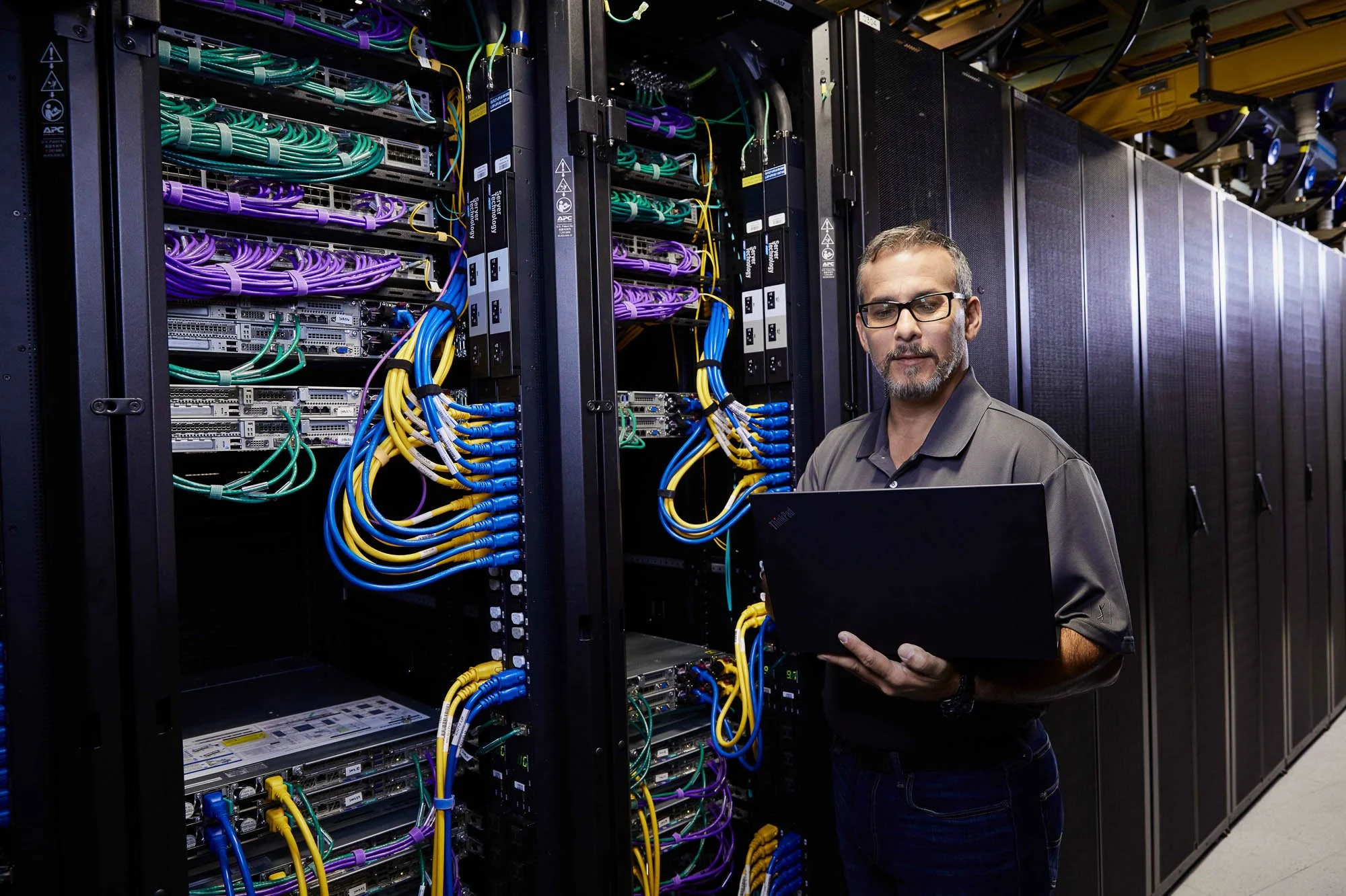 A technician working in a server room with multiple racks of network equipment, wires, and cables, holding a laptop.