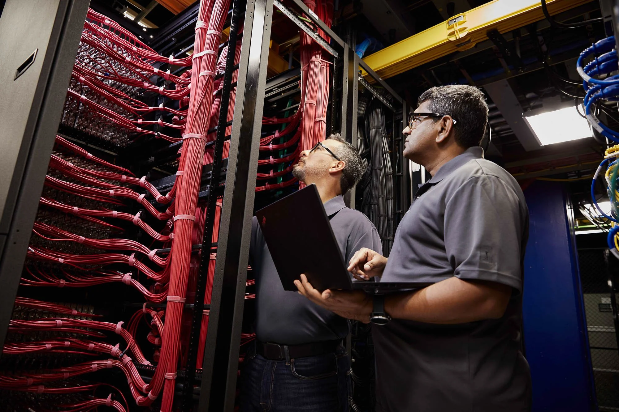 Two technicians working at a server rack with numerous red and black cables, one is holding a laptop, in a data center.