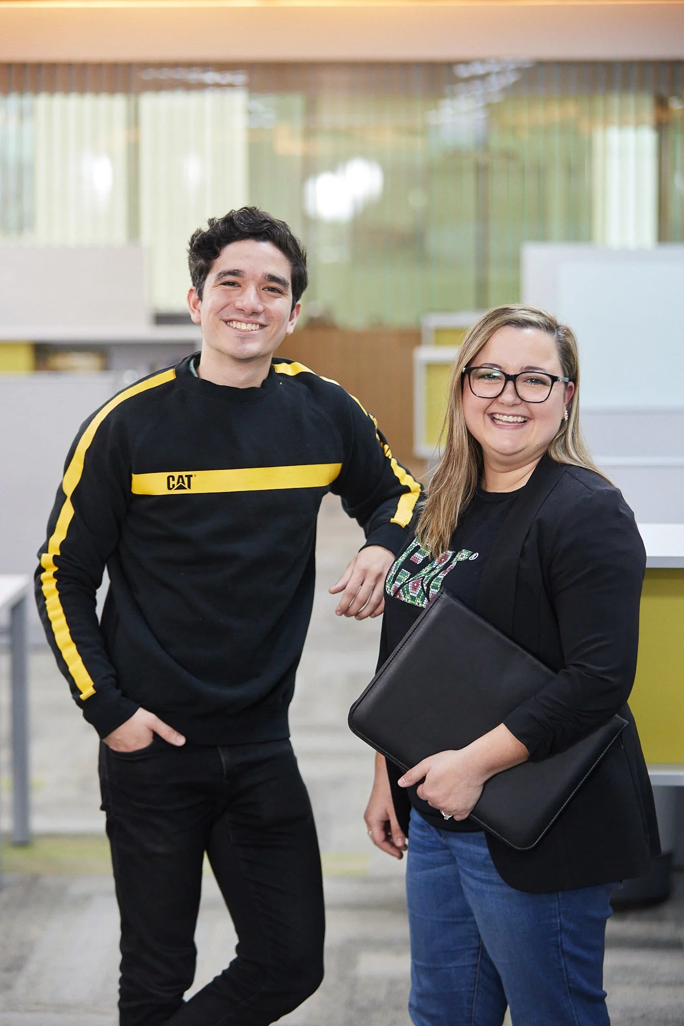 Two smiling people, a young man and a woman, standing inside an office or coworking space. The man is wearing a black and yellow CAT branded sweatshirt, and the woman is holding a black folder, wearing glasses, a black blazer, and a T-shirt with a co