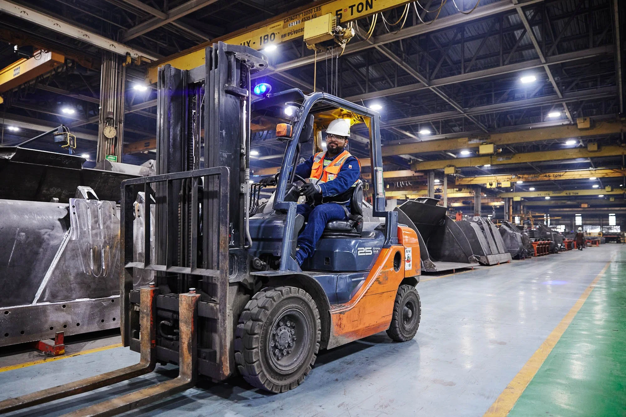 A worker operating a forklift in a large industrial warehouse filled with heavy machinery and equipment.