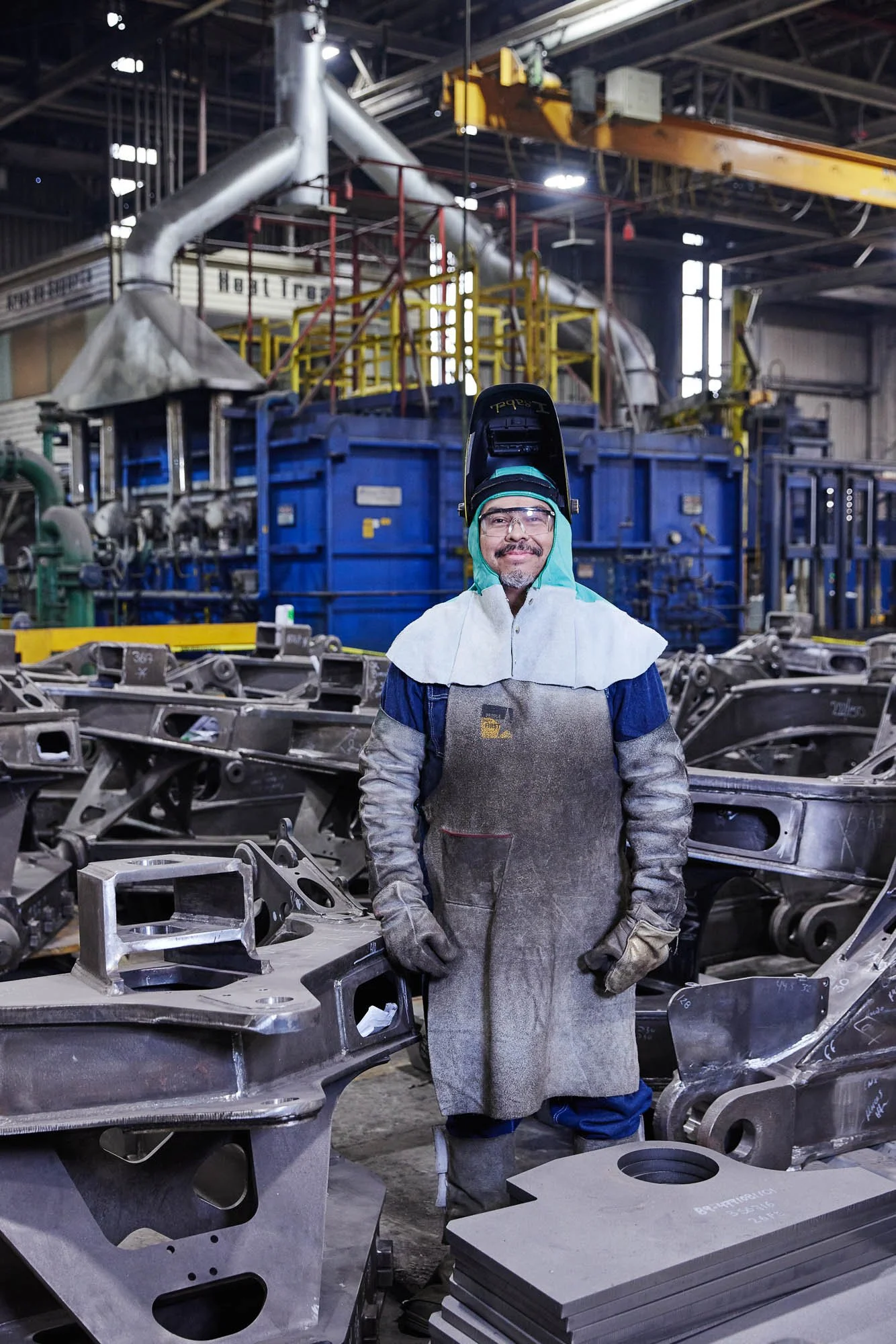 A male worker smiling in an industrial workshop surrounded by large metal structures. View fullsize