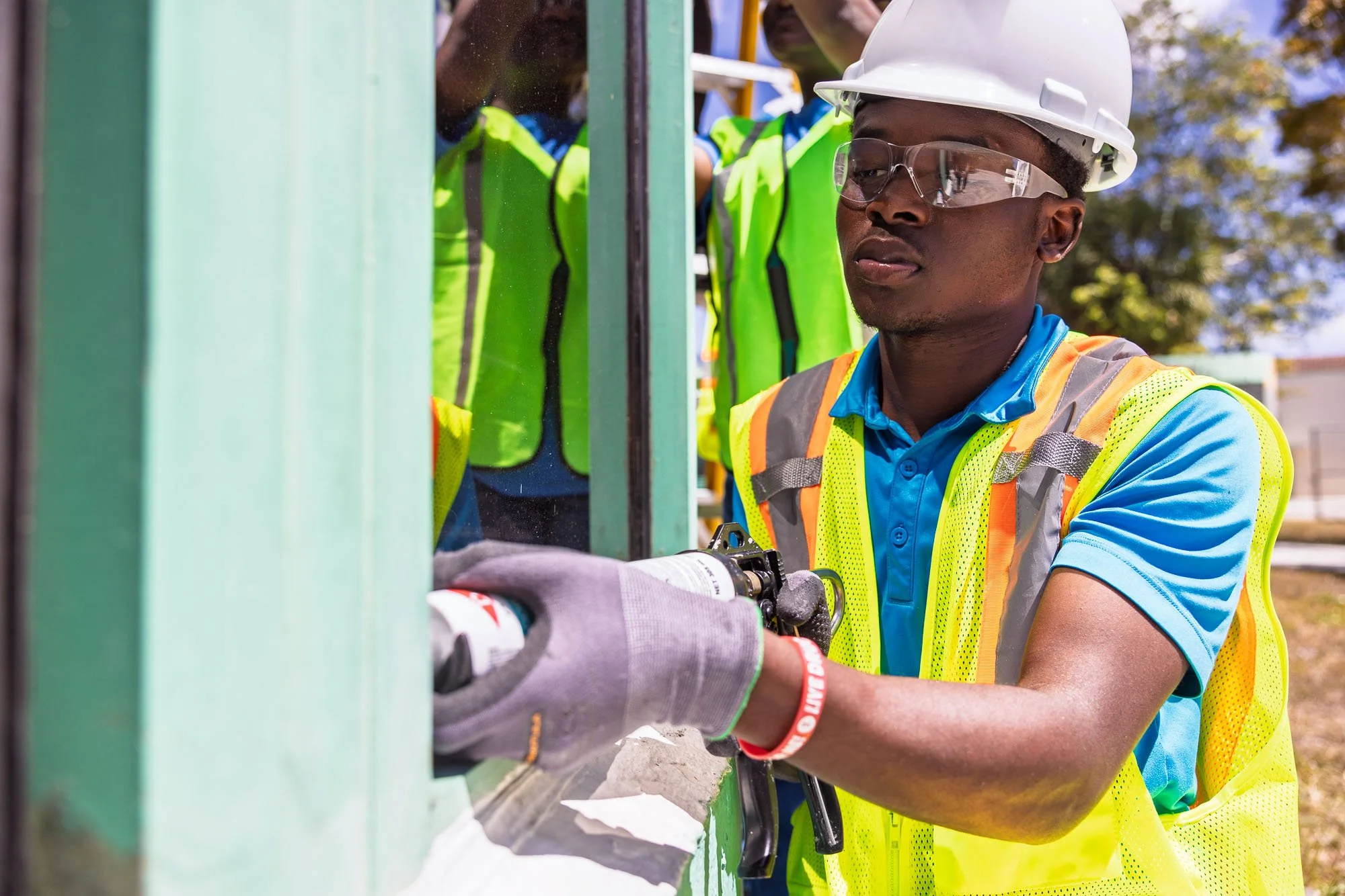 A young Black male construction worker wearing safety glasses, a white hard hat, a blue polo shirt, and a yellow safety vest operating a fire extinguisher on a green electrical box outdoors during daytime.