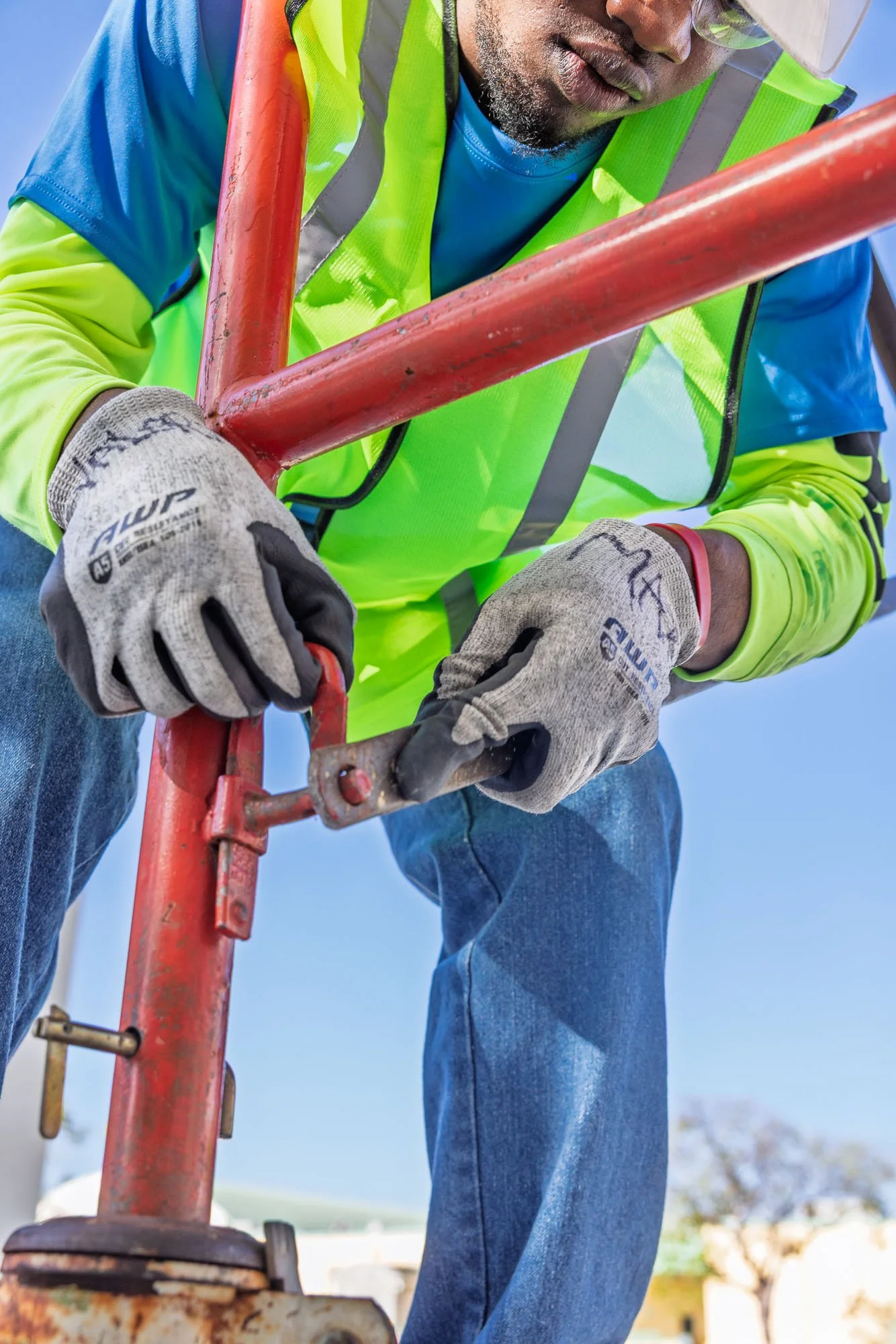 A construction worker wearing safety gear and a neon vest is adjusting a red metal scaffold.