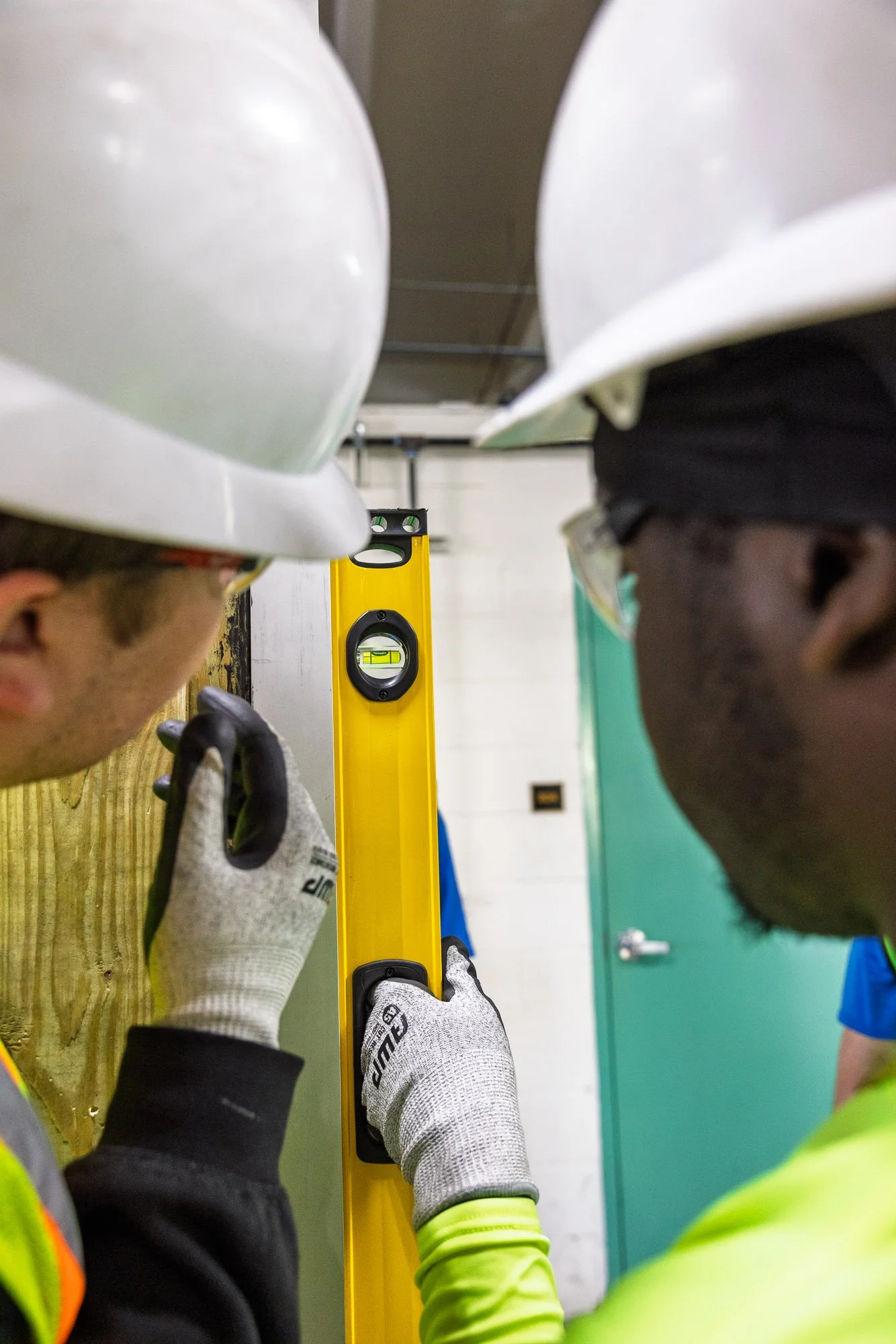 Two construction workers in helmets and gloves use a spirit level to check the alignment of a wooden surface.