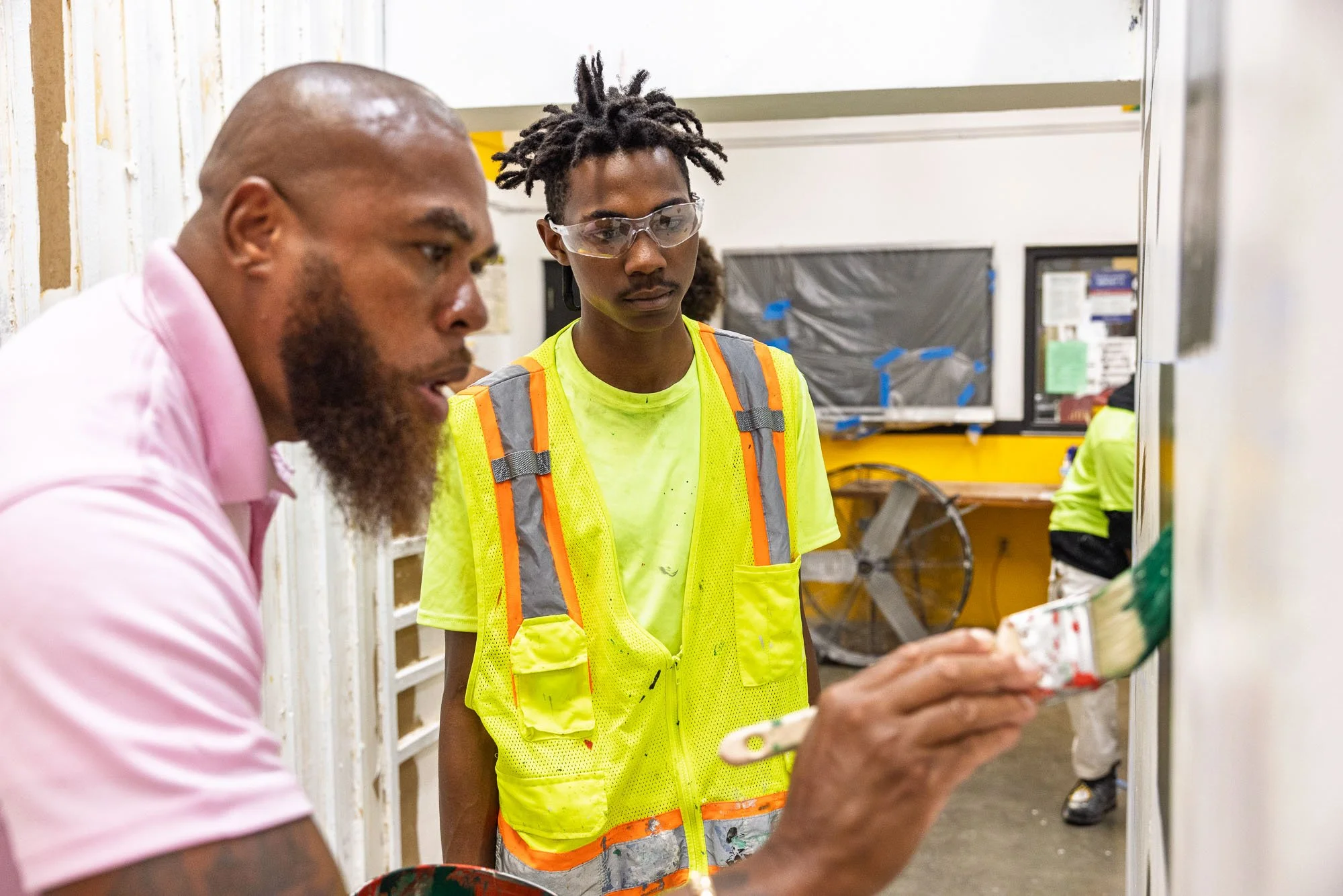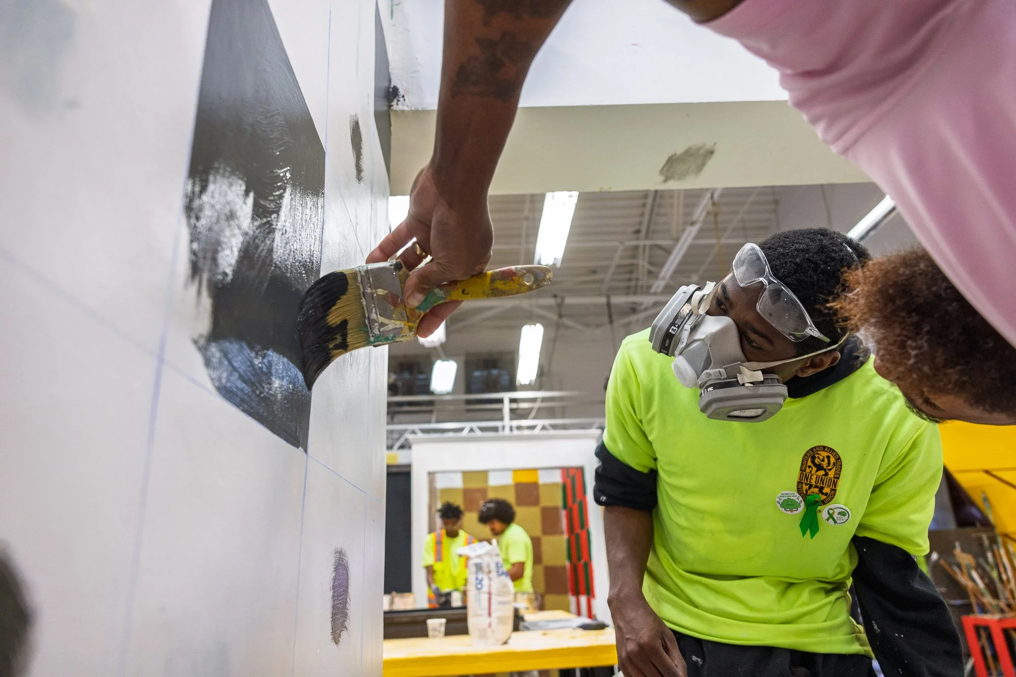 Person wearing a neon yellow shirt and safety mask painting a wall with a paintbrush in an indoor space, with other individuals working in the background. View fullsize