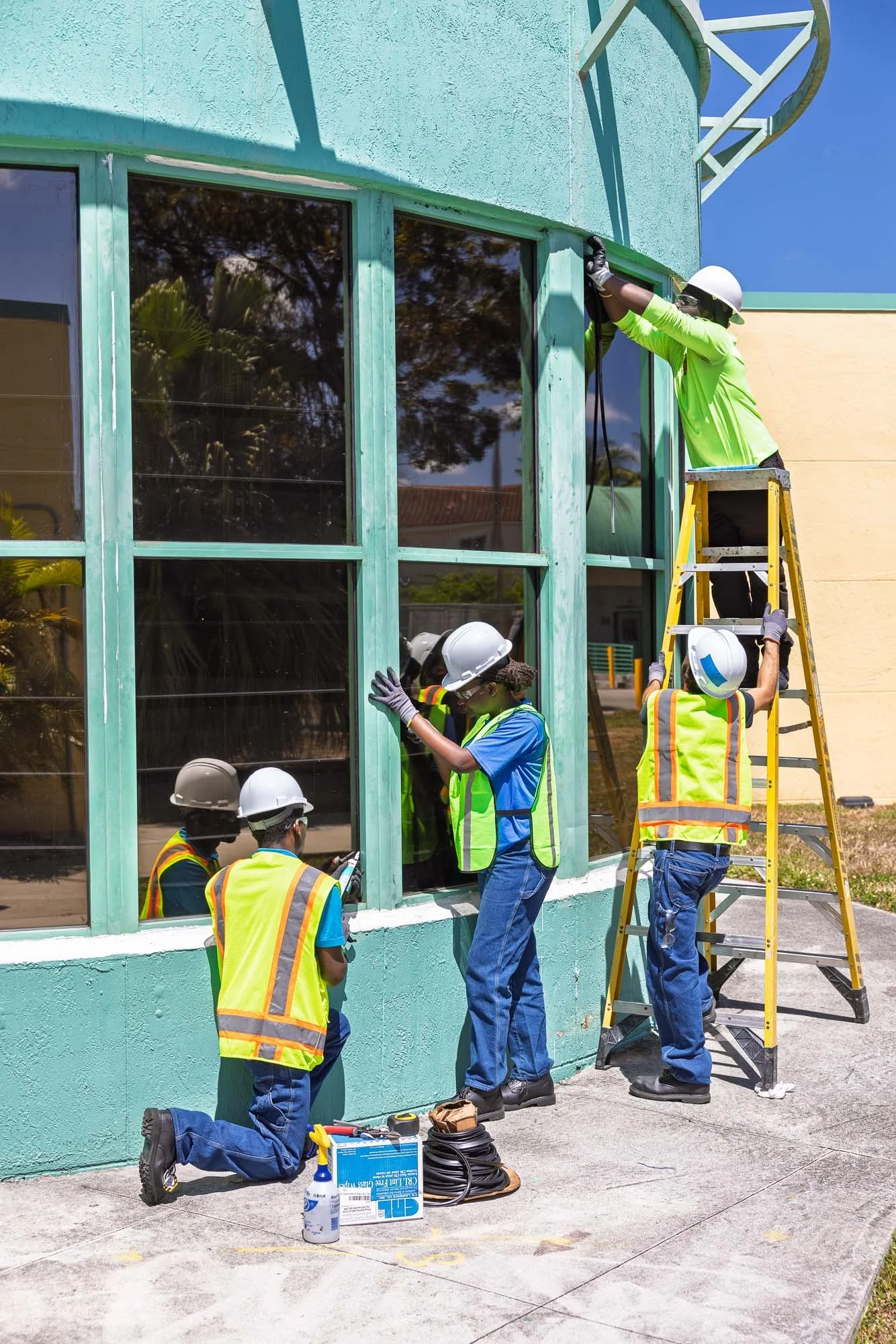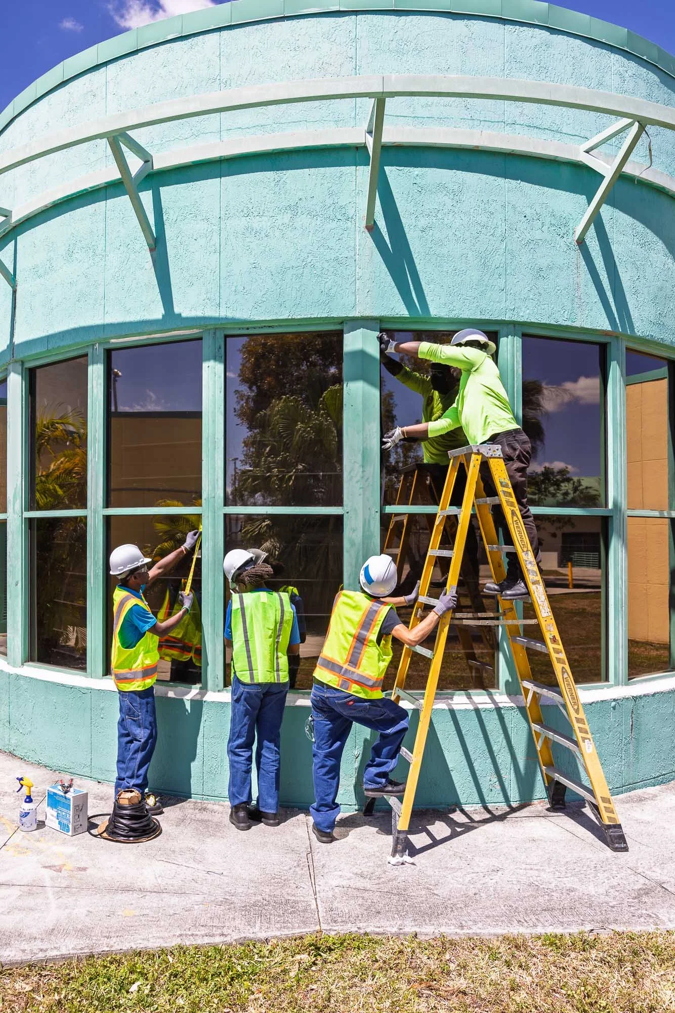 Five construction workers, wearing safety vests and helmets, are installing or repairing a large outdoor window on a building with a teal-colored exterior.