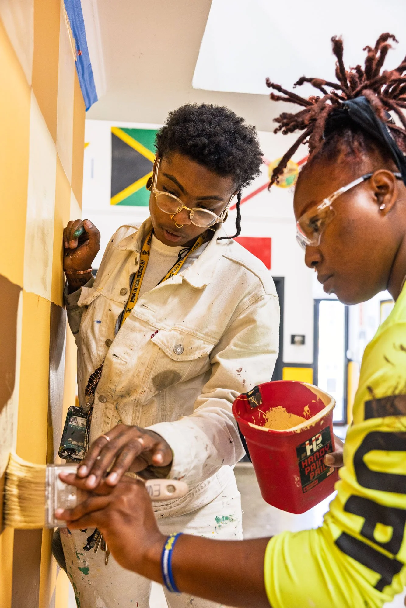 Two individuals working together on a wall, one with glasses and a nose ring, focusing on painting or applying something to a yellow wall.