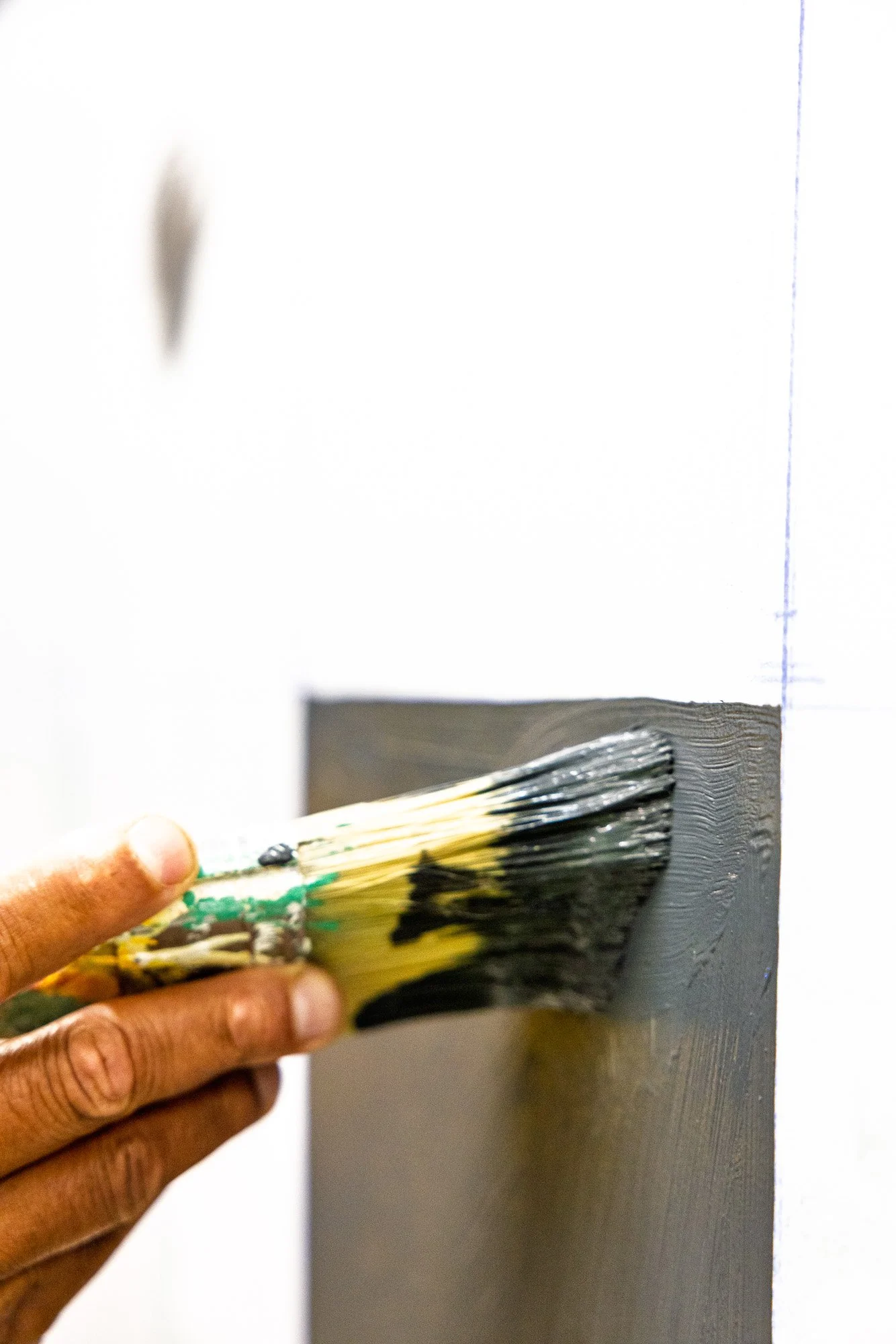 A person painting a wall with black paint using a paintbrush. View fullsize