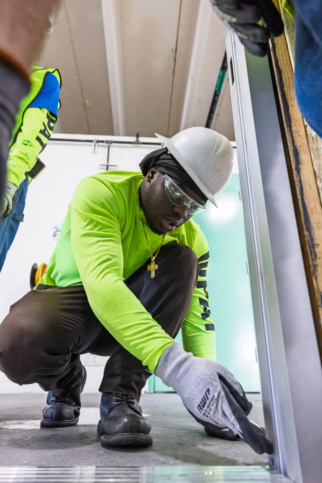A construction worker wearing a white hard hat, safety glasses, a neon yellow long sleeve shirt, and gray work gloves is kneeling on the floor and using a tool to work on a metal frame. Another worker in similar attire is partially visible on the lef