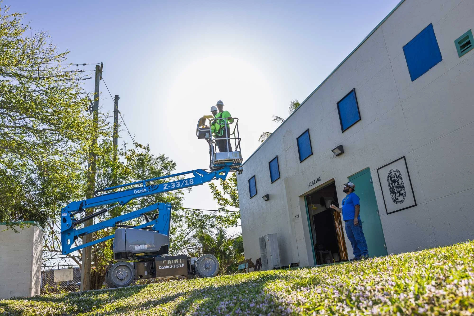 Workers using a lift to perform maintenance or inspection on the exterior of a building with blue window frames and a door labeled 'GLAZING'.
