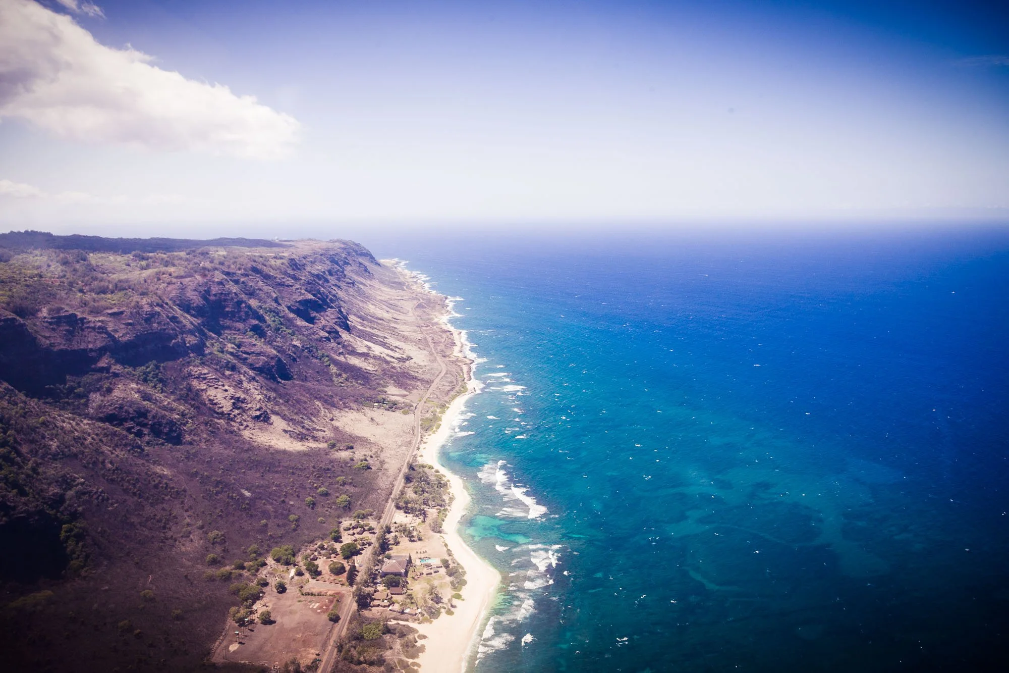 Aerial view of a coastal landscape with steep cliffs on the left and the ocean on the right, along with some small buildings near the shoreline. View fullsize