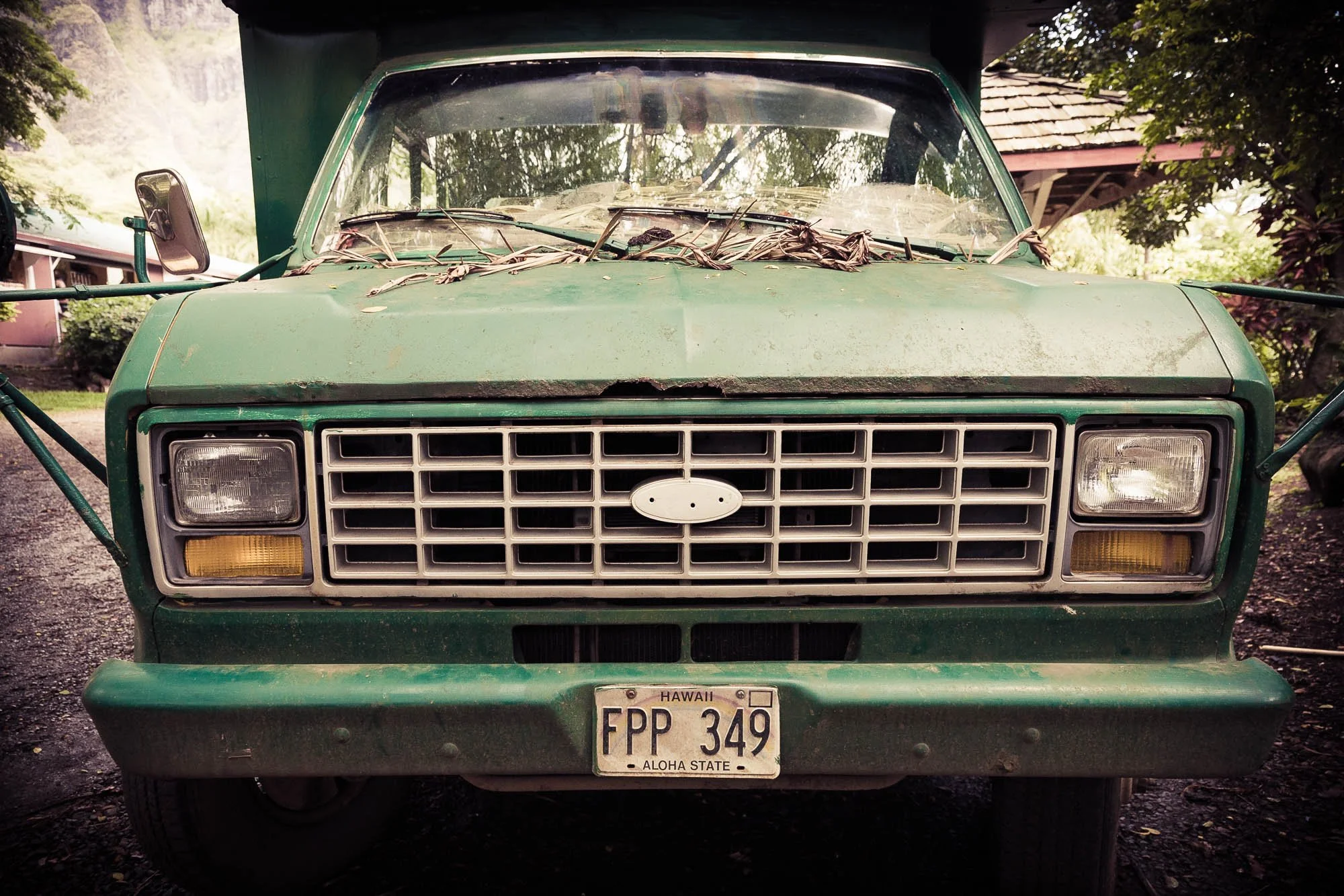 Front view of an old, green, dusty Ford vehicle with Hawaii license plate FPP 349, parked outdoors with overgrown leaves on the windshield and dirt on the bumper. View fullsize