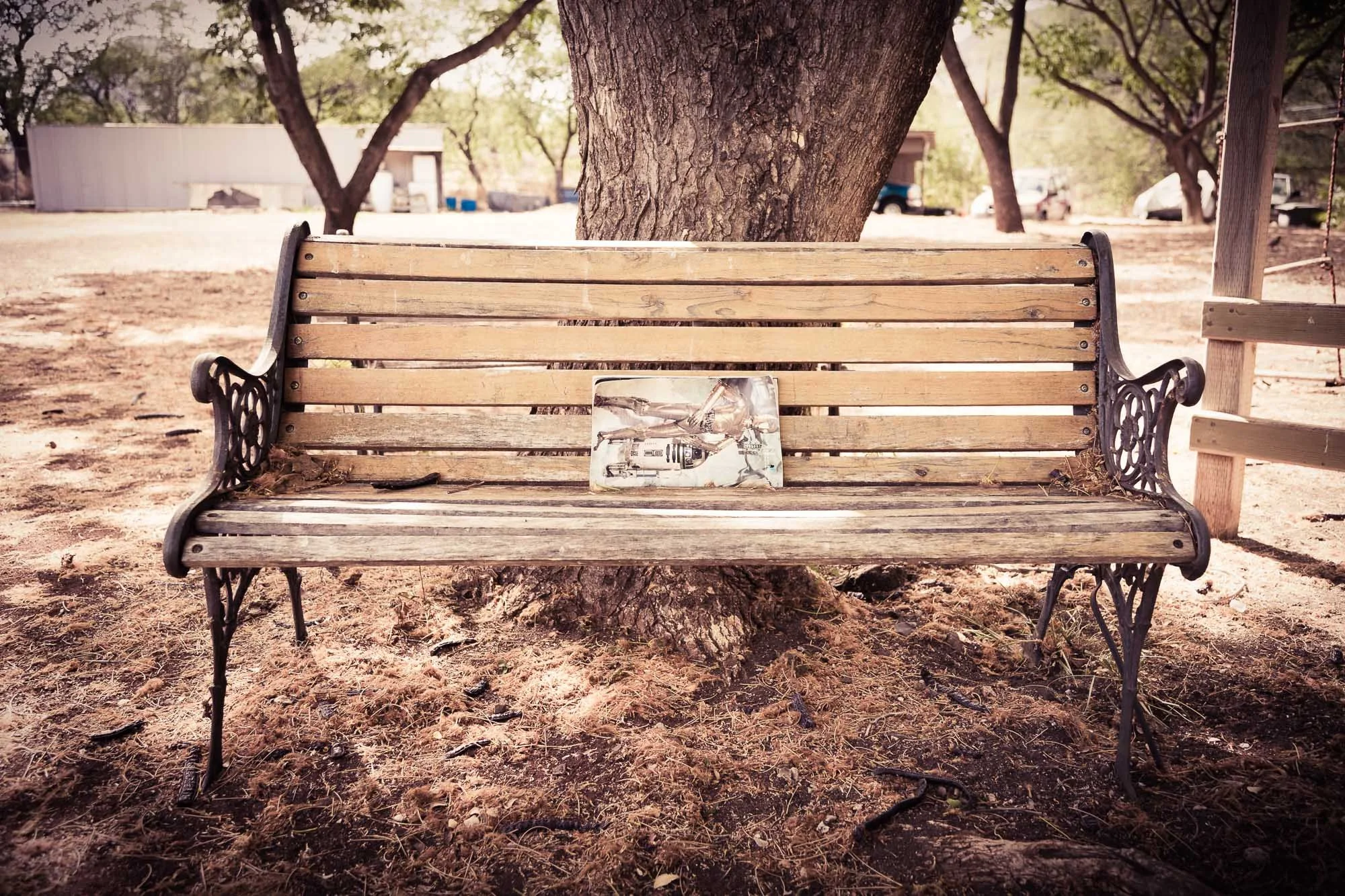 Empty wooden park bench with cast iron armrests and legs, positioned under a large tree with a wooden fence to the right, in a dirt area with sparse grass and a small damaged poster on the bench. View fullsize