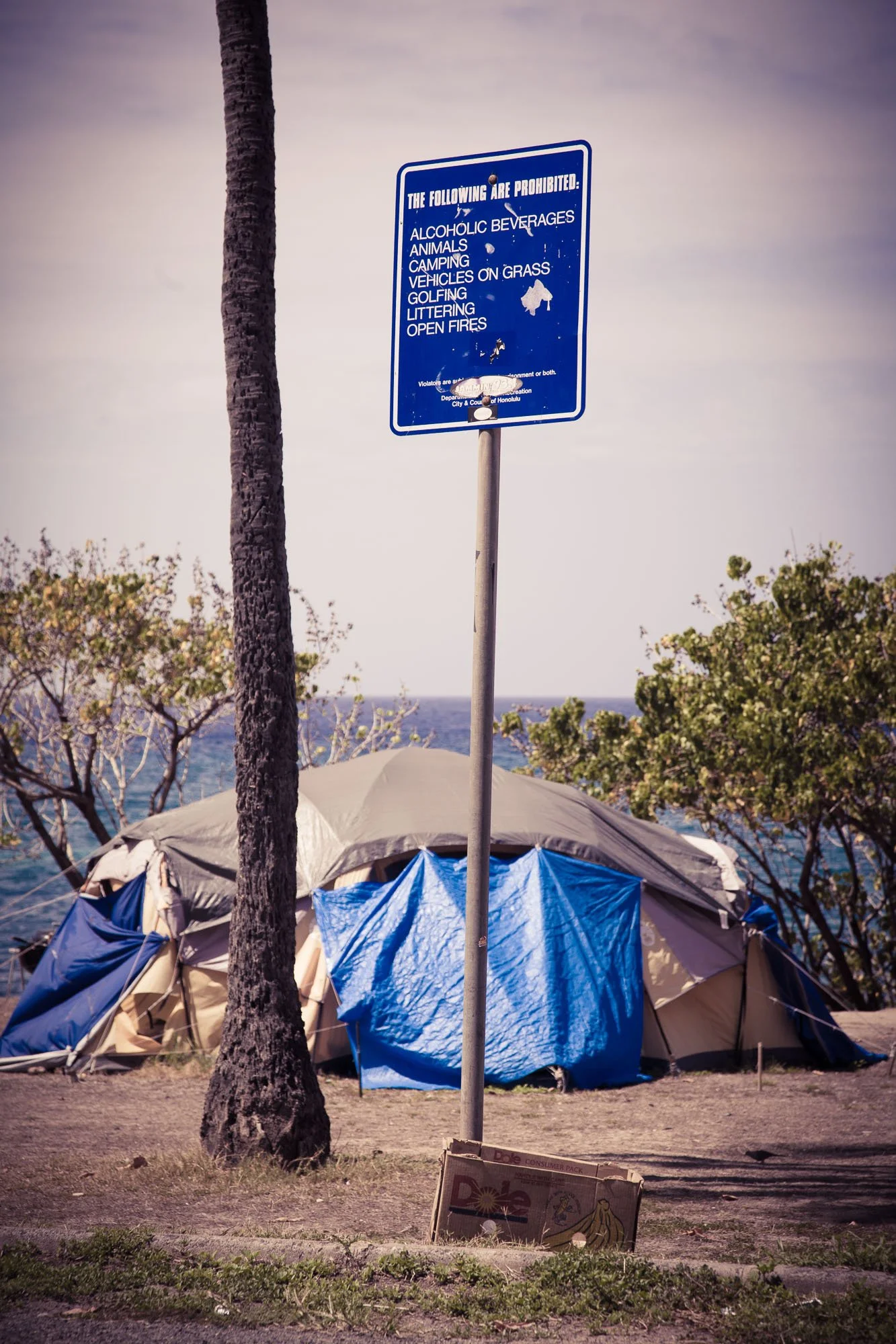 A sign listing prohibited activities such as alcohol beverages, animals, camping, vehicles on grass, golfing, littering, open fires, with trees, a tent, and the ocean in the background.