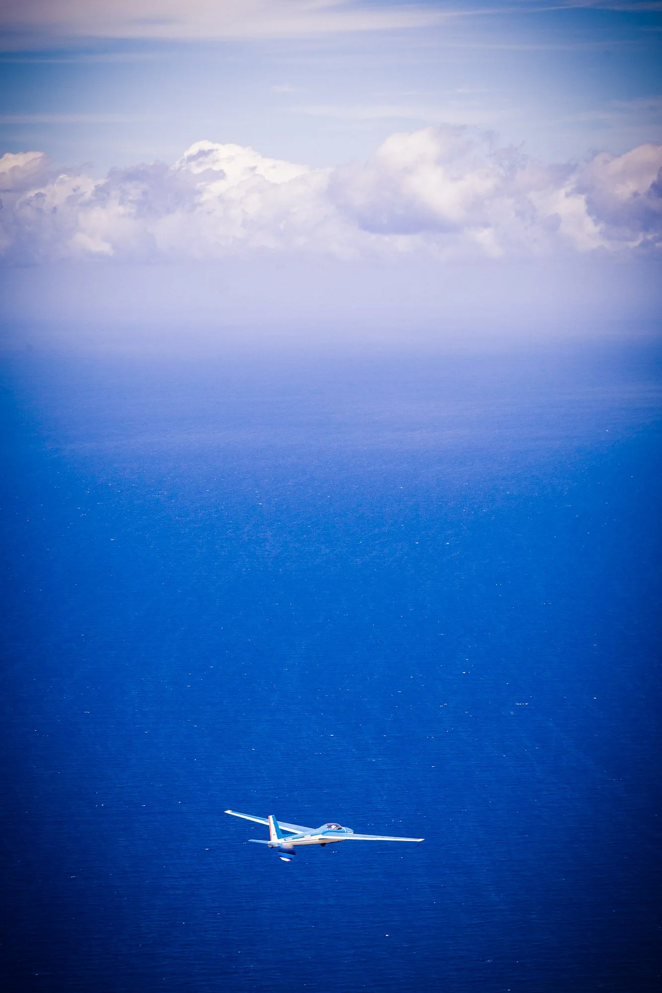 View from a small aircraft looking out over a vast blue ocean with a distant horizon and a partly cloudy sky.