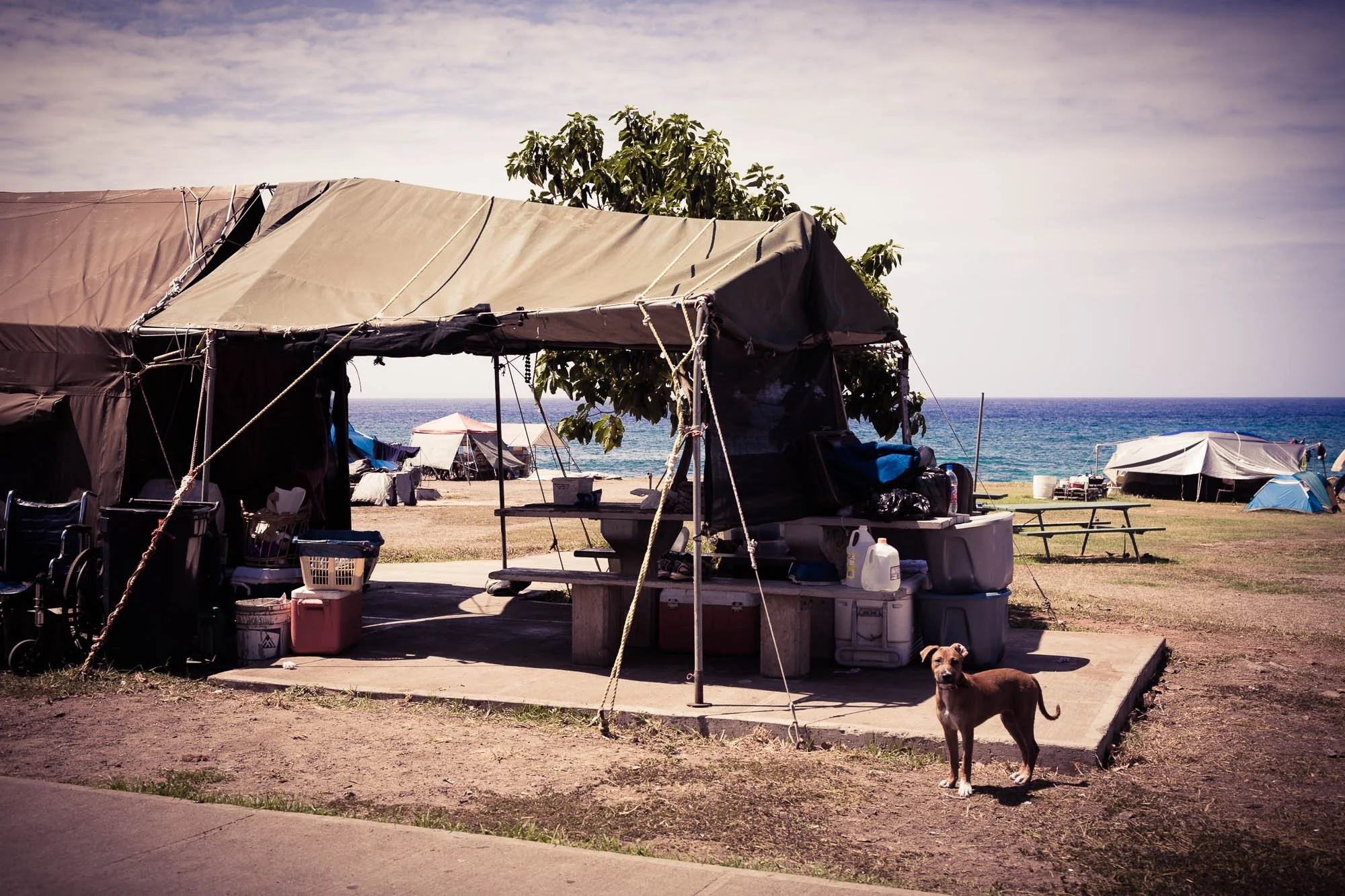 Camping scene near the ocean with tents, a dog standing on a concrete pad, and a canopy shelter. View fullsize