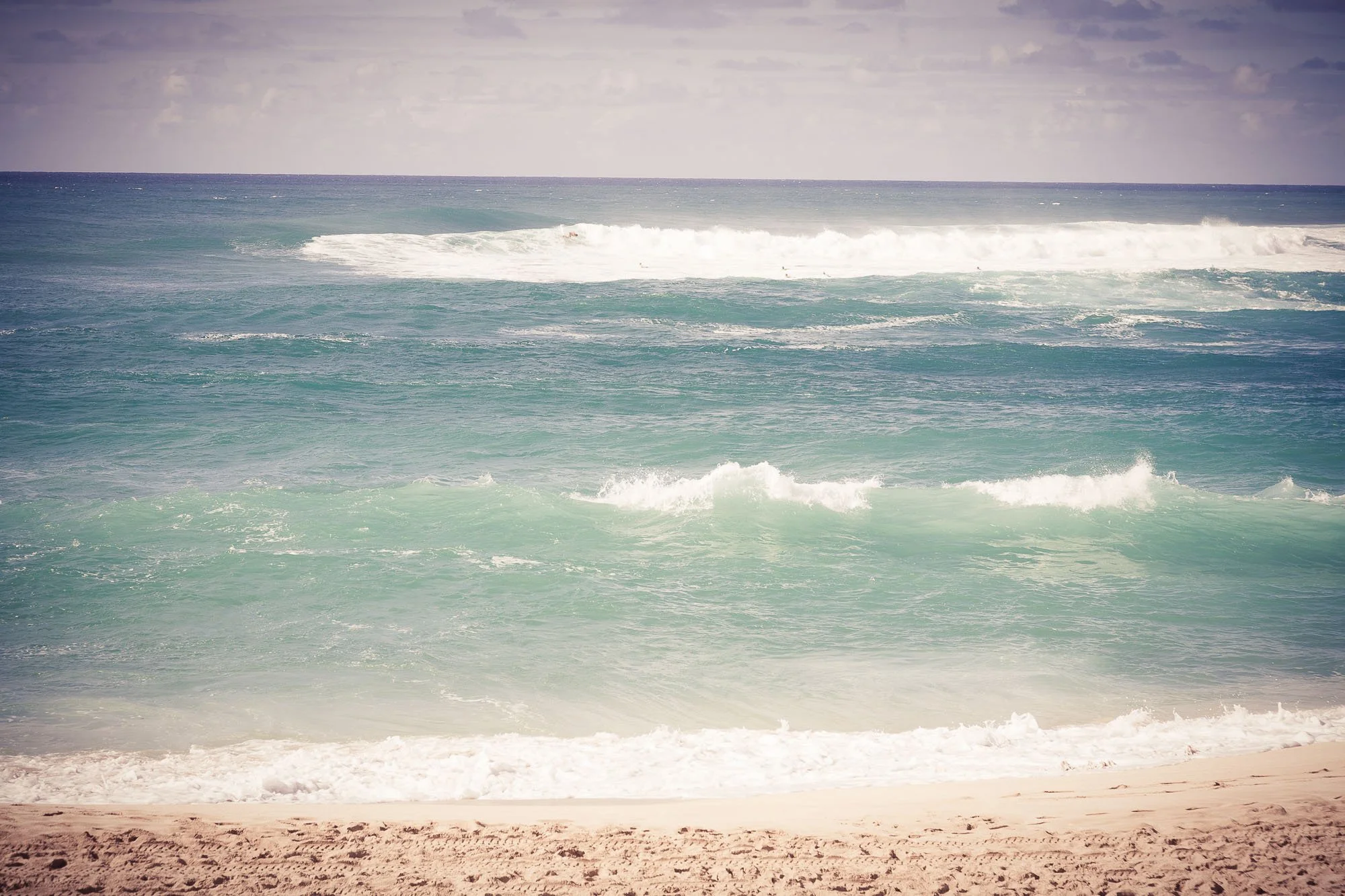 Oceanside view of sandy beach with turquoise water and white waves under cloudy sky.