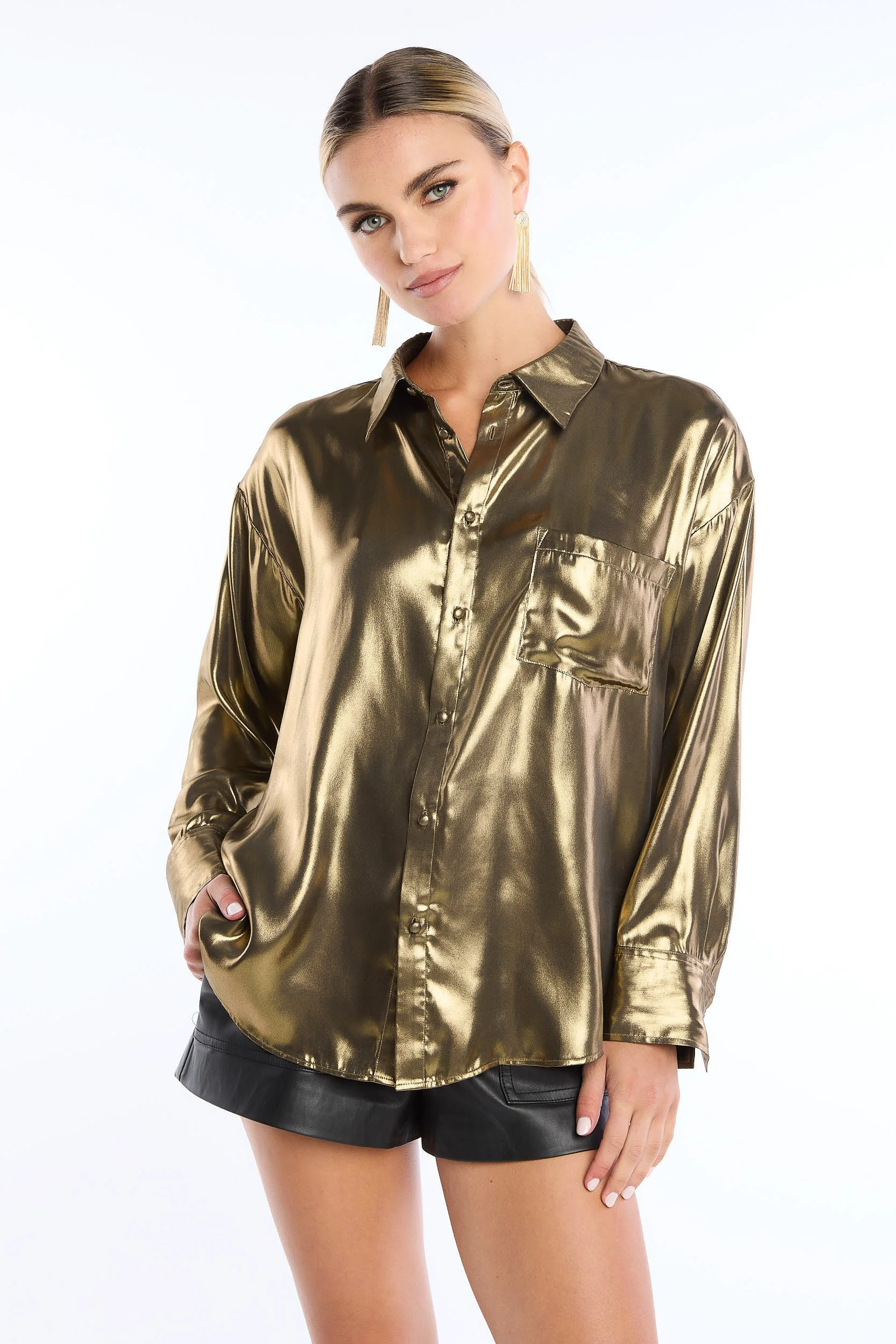 A woman wearing a shiny, gold metallic button-up shirt and black shorts, standing against a white background.