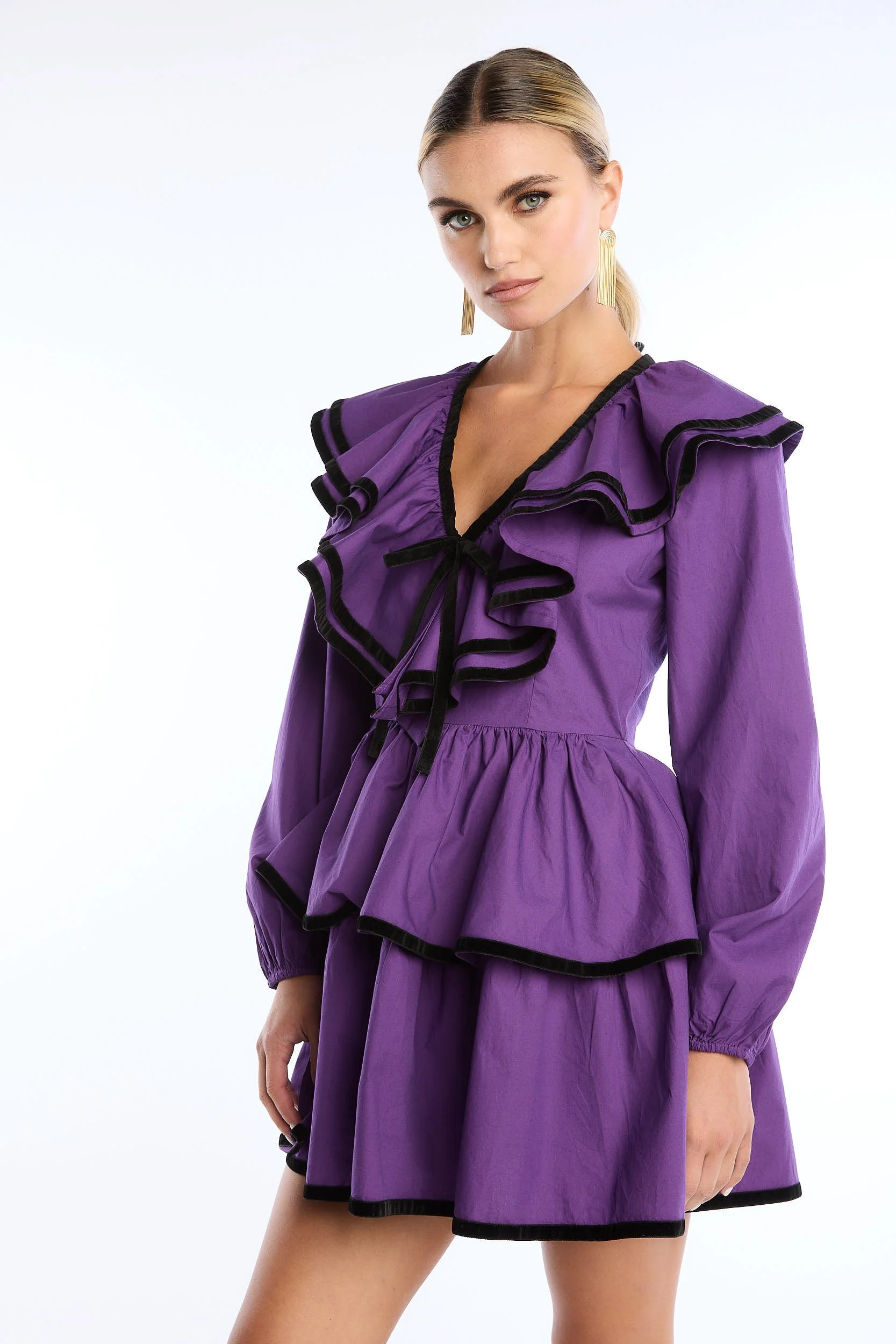 A woman wearing a purple dress with black accents, ruffles, and a pleated skirt, standing against a plain white background.