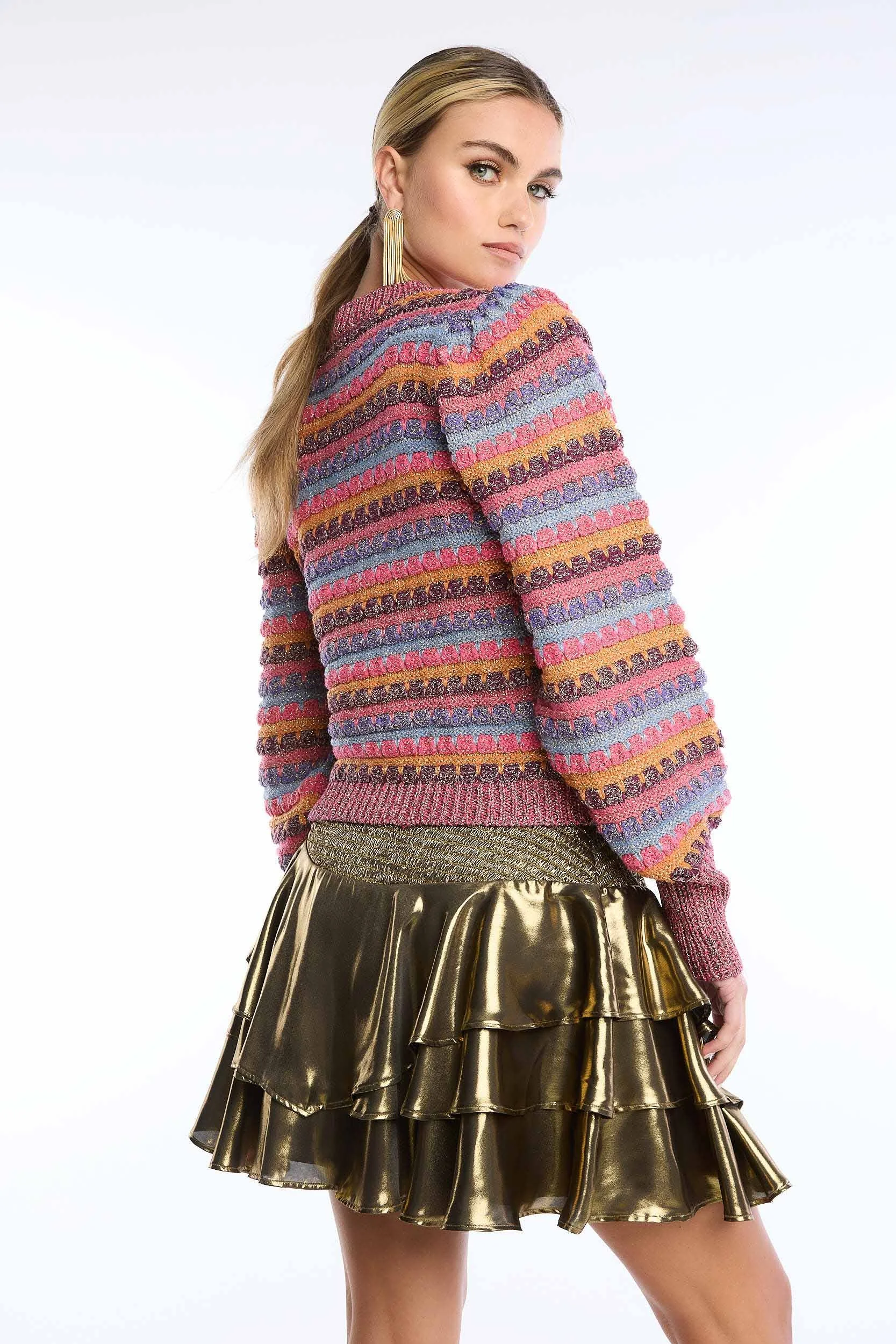 A woman with blonde hair wearing a colorful striped sweater, gold metallic ruffled skirt, and long earrings, looking over her shoulder against a plain white background. View fullsize