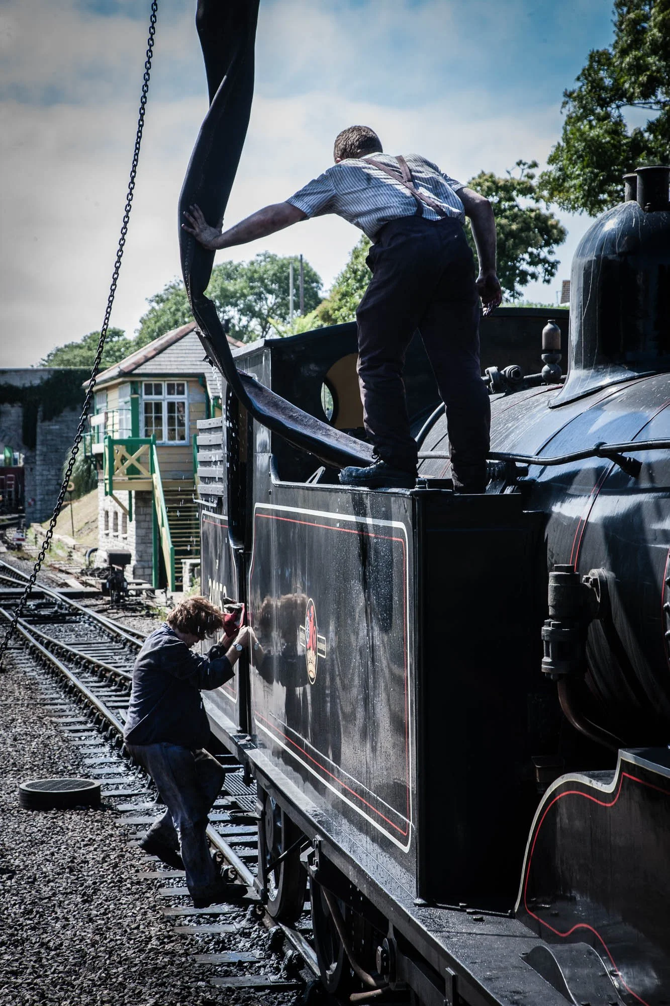 Two men working on a black steam locomotive outdoors next to railway tracks, with a small house and trees in the background.
