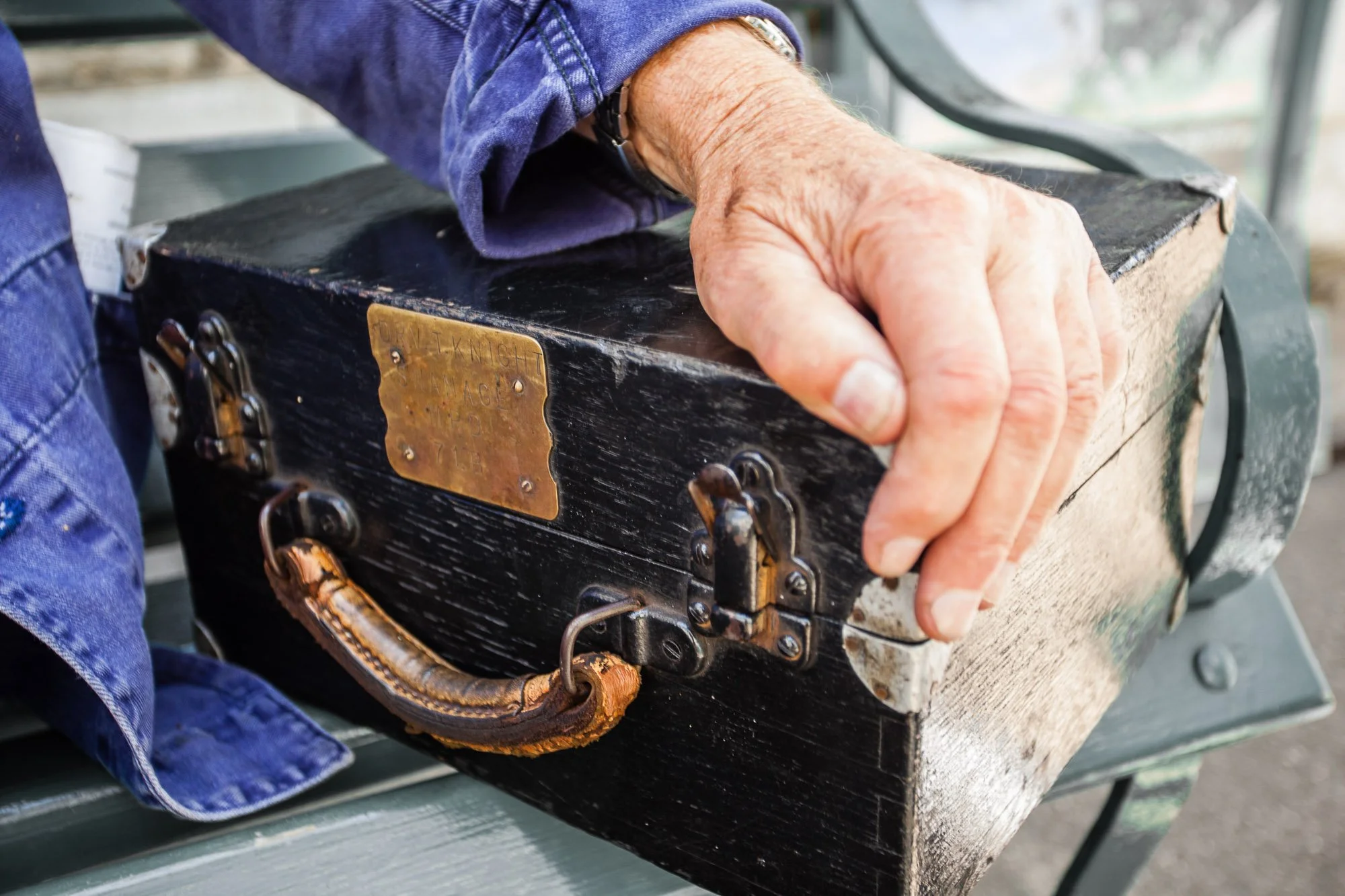 Close-up of a person's hand resting on an old black wooden box with metal hardware and a leather handle, sitting on a green bench.