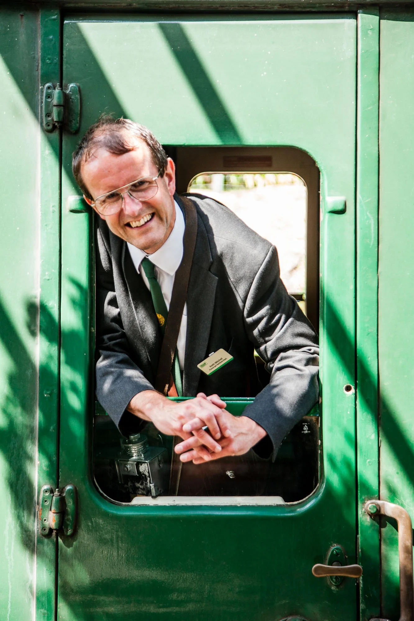 A train conductor wearing a uniform and cap leaning out of a green vintage train car, looking towards the camera on a scenic platform with green hills in the background. View fullsize