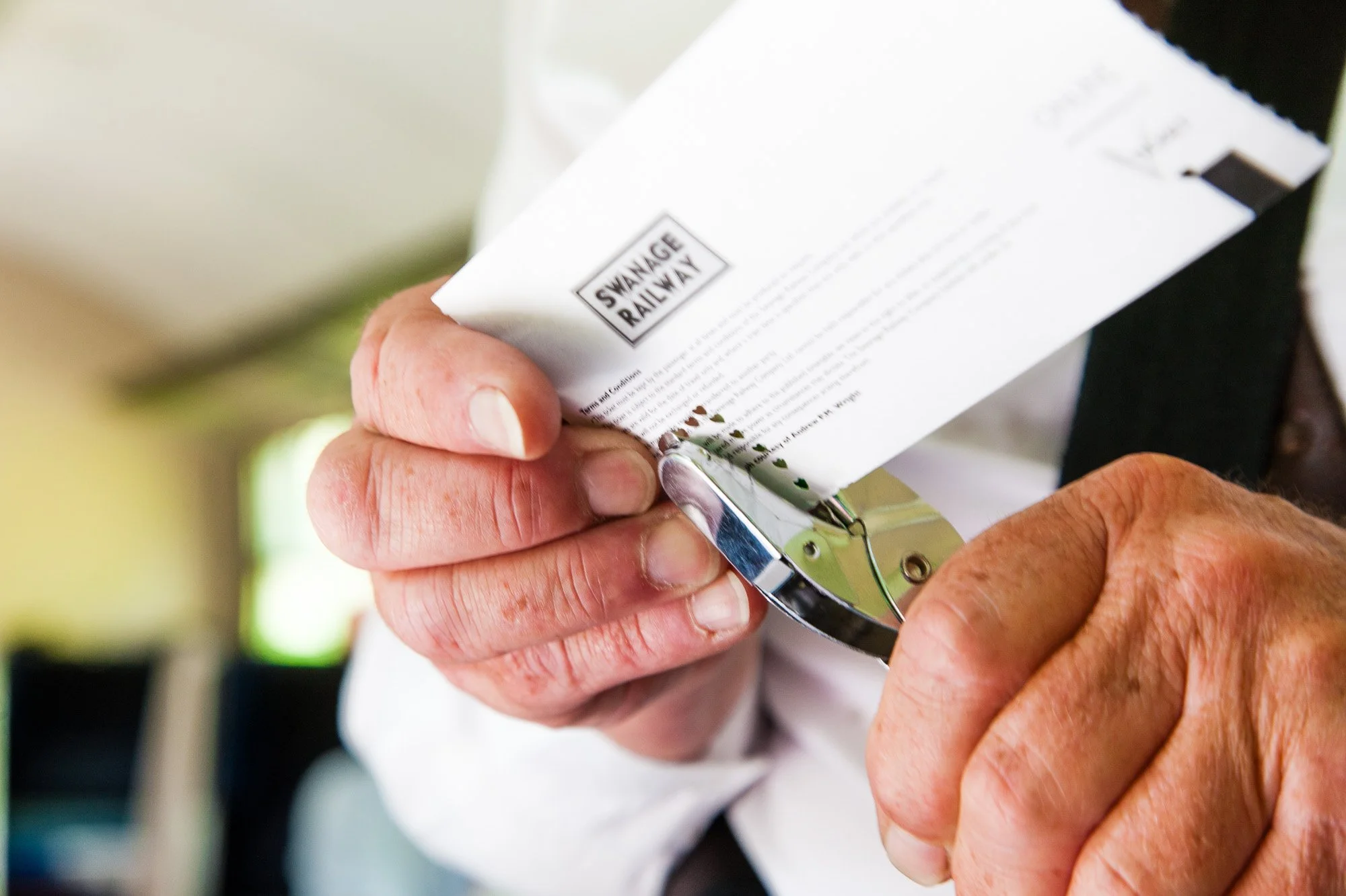 Close-up of an elderly person holding a paper and using a metal hole puncher with the label 'Swindon Railway' visible on the paper.