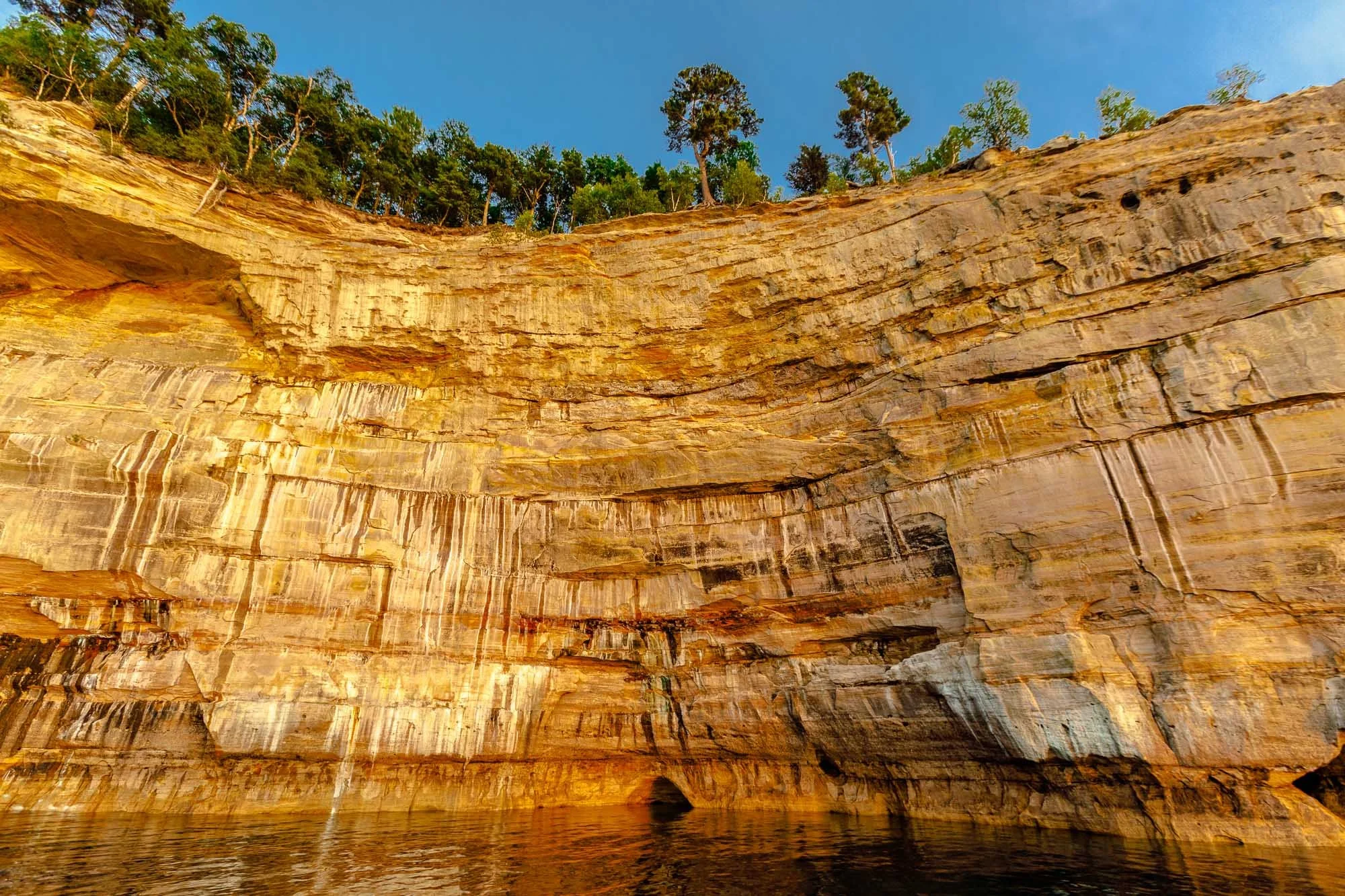 Cliffside with layered rocks, some trees on top, and water at the base under a blue sky.