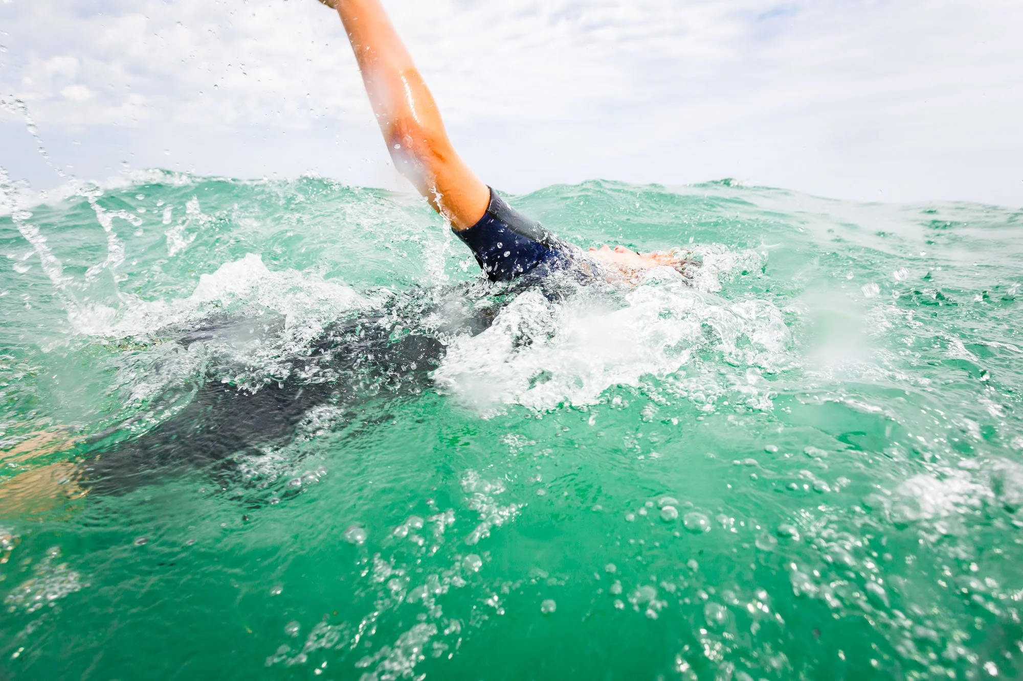 Person wearing a black shirt and blue shorts swimming in the ocean with splashing water.
