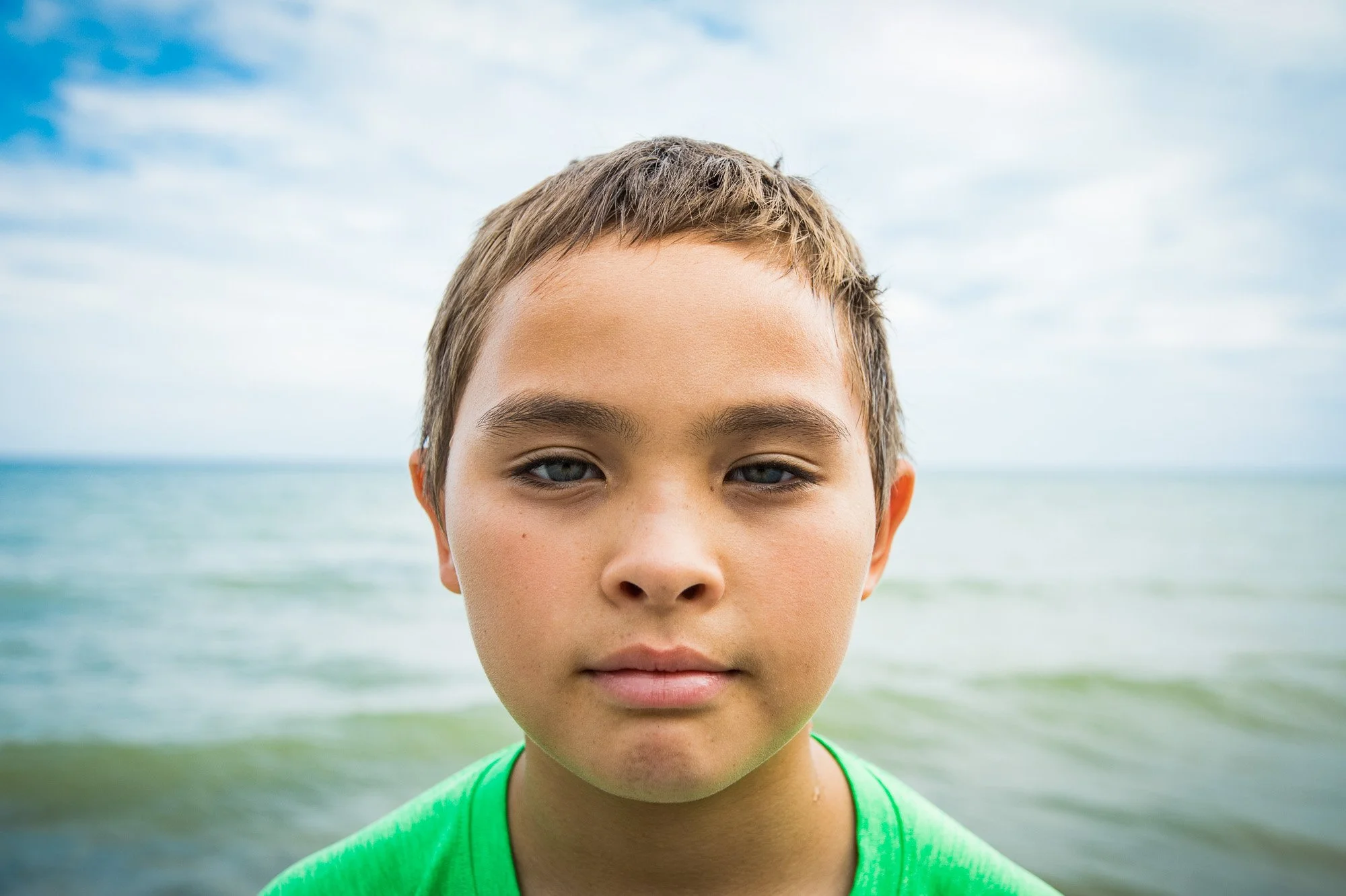 Close-up of a boy with short light brown hair and blue eyes standing in front of a body of water and cloudy sky.