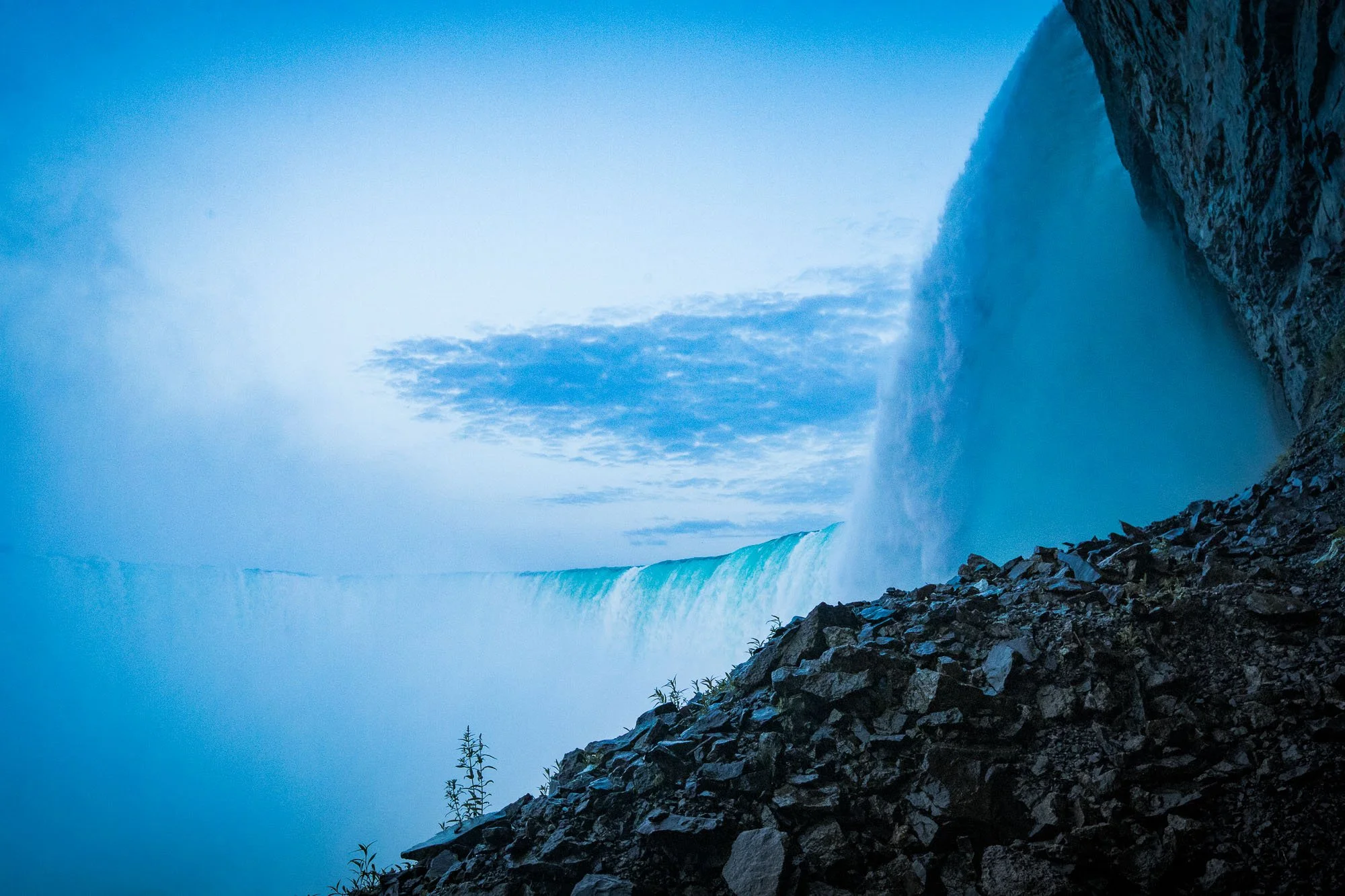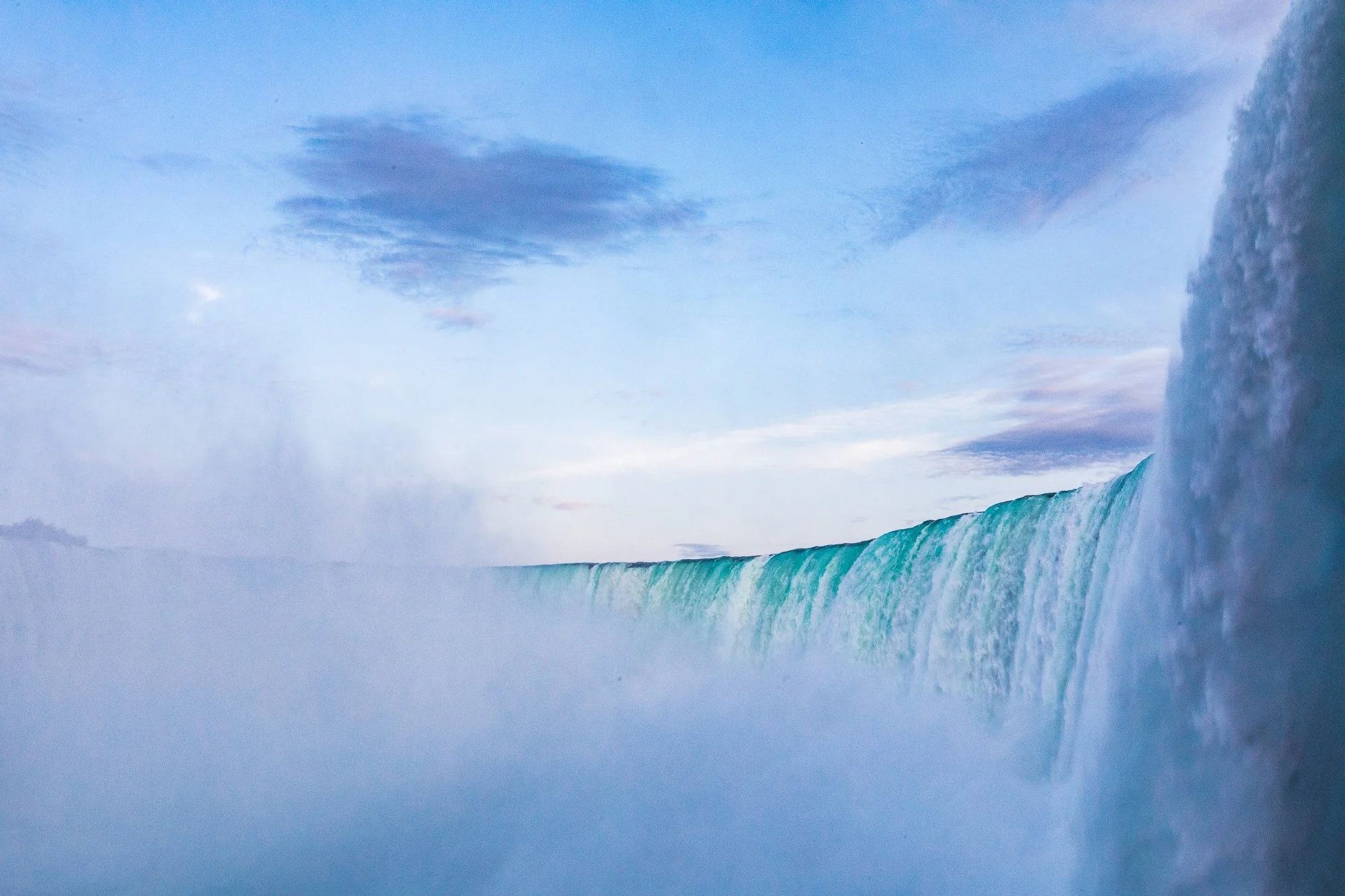 A waterfall with mist rising at the base, a partly cloudy sky with blue tones, and water cascading over the edge. View fullsize