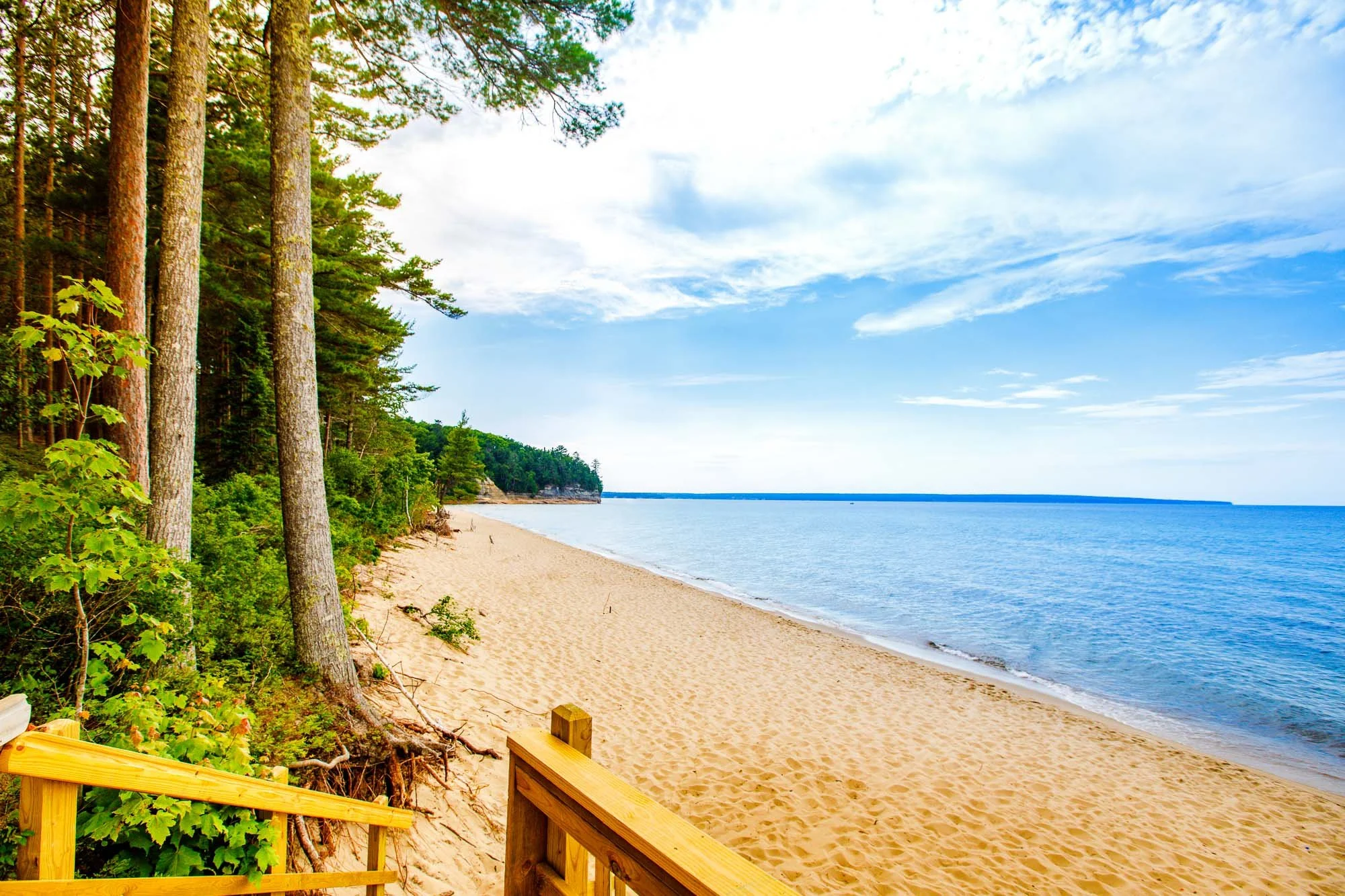 Sunny sandy beach with a wooden railing, trees on the left, calm blue water, and a partly cloudy sky in the background.