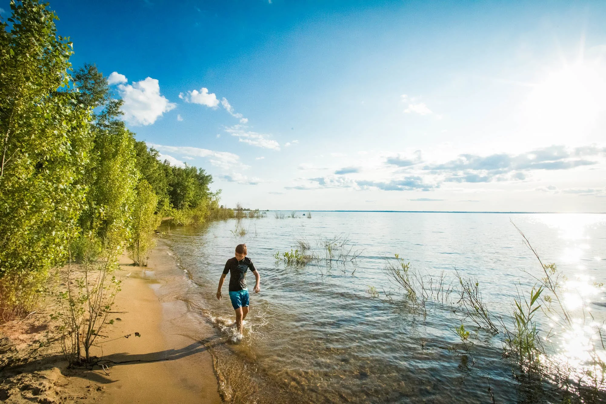A boy walking along a sandy lakeshore with green trees on the left and a bright blue sky with clouds above. View fullsize
