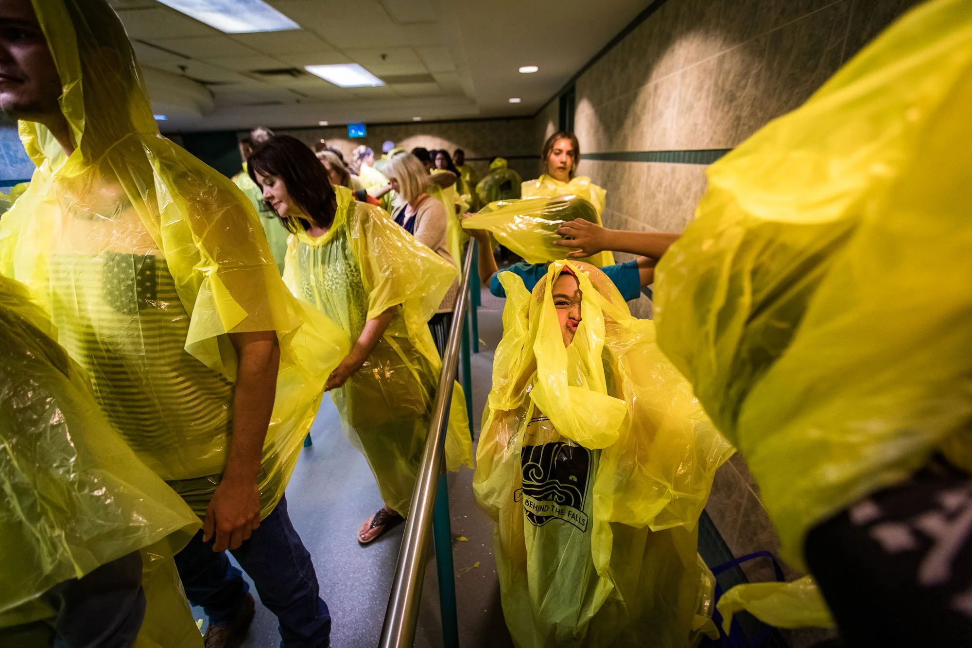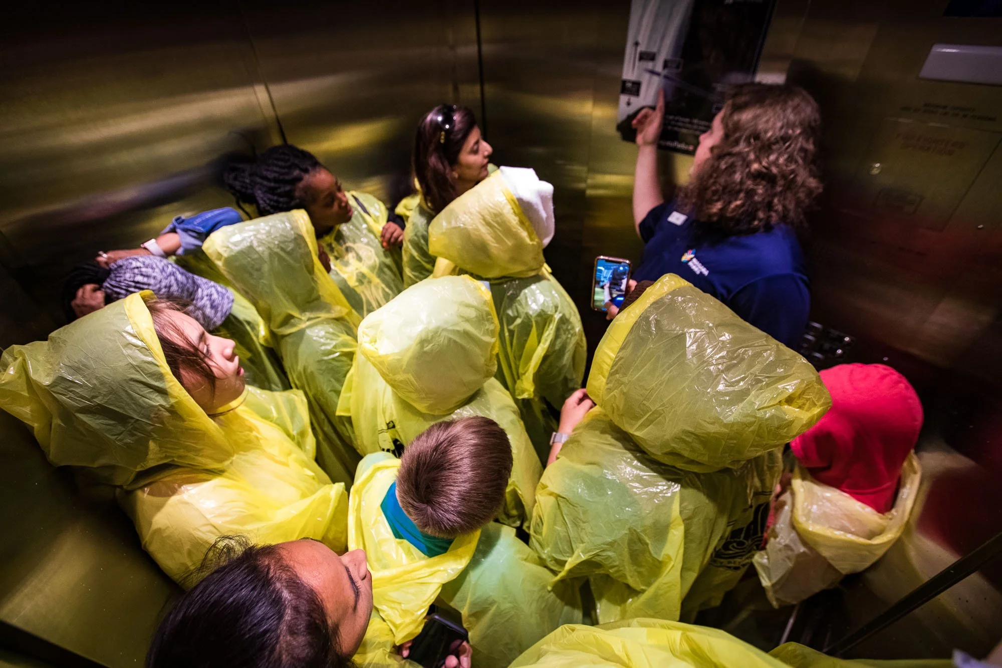 Group of people wearing yellow rain ponchos inside an elevator, with one person showing a safety information card and another taking a photo. View fullsize