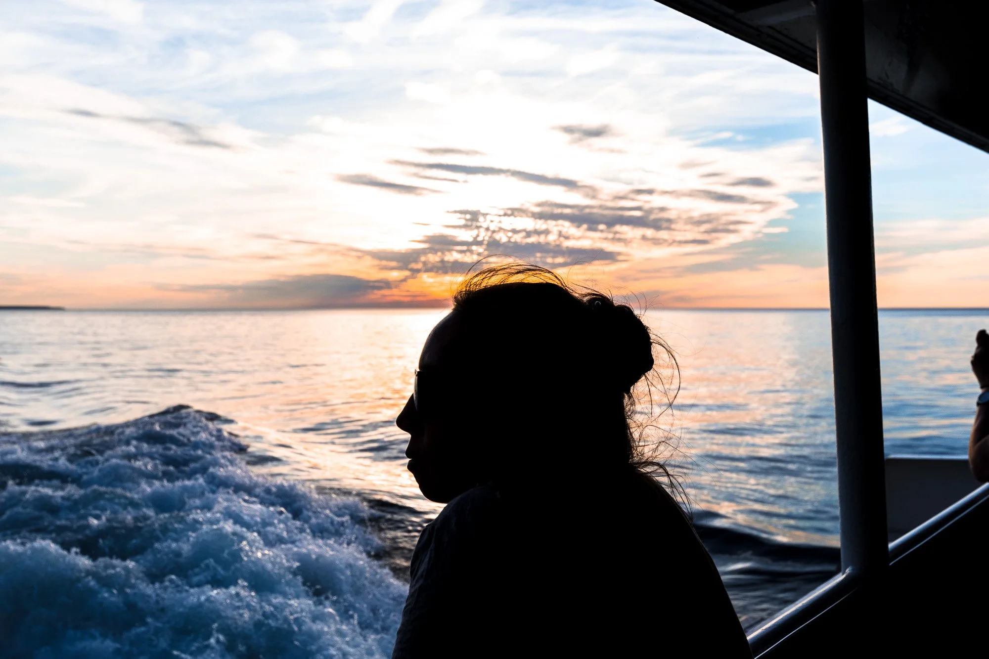 Silhouette of a woman with glasses on a boat at sunset, with the ocean and sky in the background.