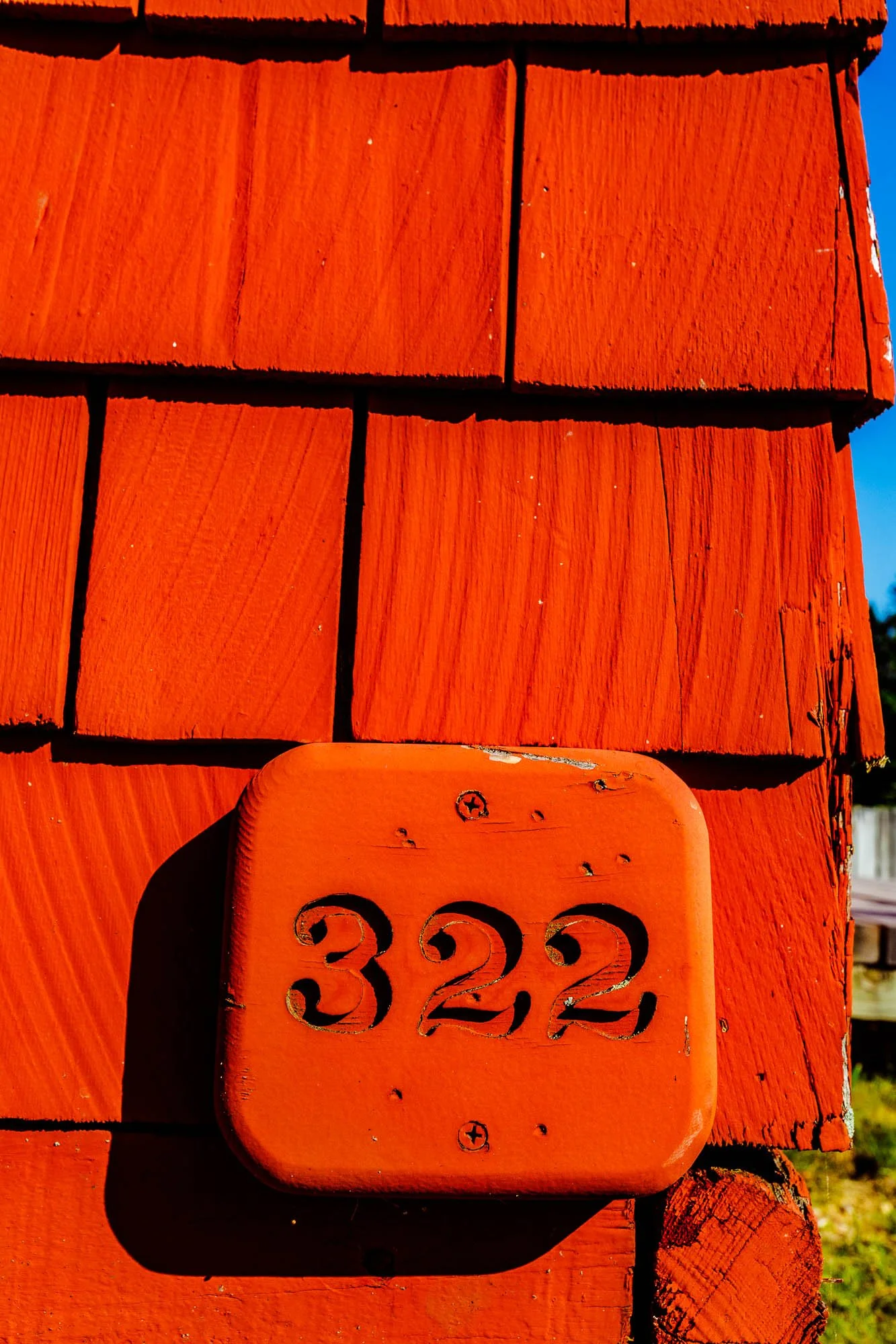 Close-up of a red wooden exterior wall with an orange house number plaque displaying '322'. The plaque is mounted on the wall, and the sunlight casts shadows on it. View fullsize