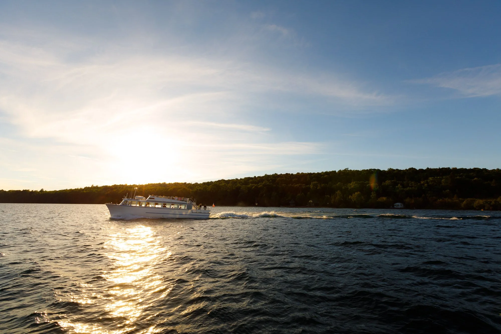 Boat sailing on a lake during sunset with a wooded shoreline in the background.
