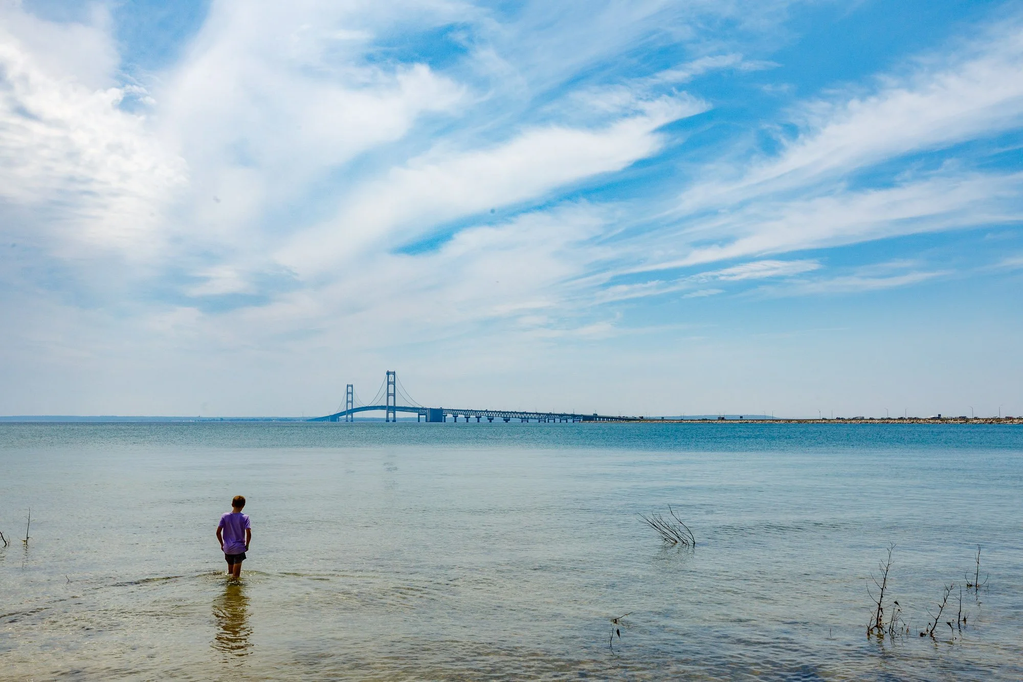 A person wading in shallow water near the shore of a large body of water, with a bridge in the distance and a partly cloudy blue sky above.