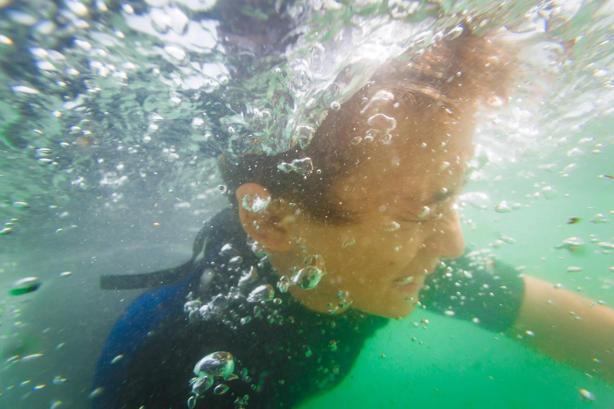 Person swimming underwater, close-up of face and ear, with bubbles around.