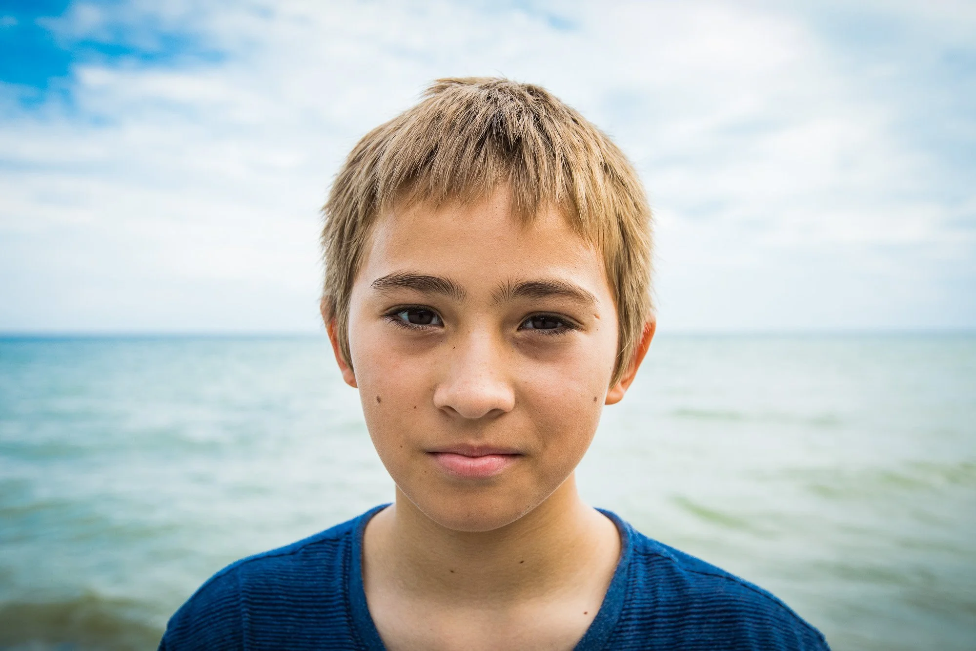 Close-up of a boy with short light brown hair and blue eyes standing in front of a body of water and cloudy sky. View fullsize
