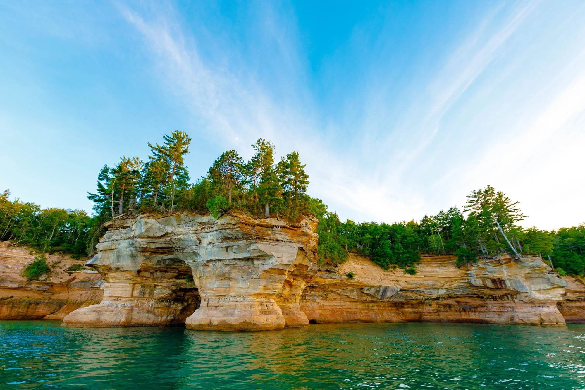 Cliffside with trees along water under blue sky with wispy clouds View fullsize