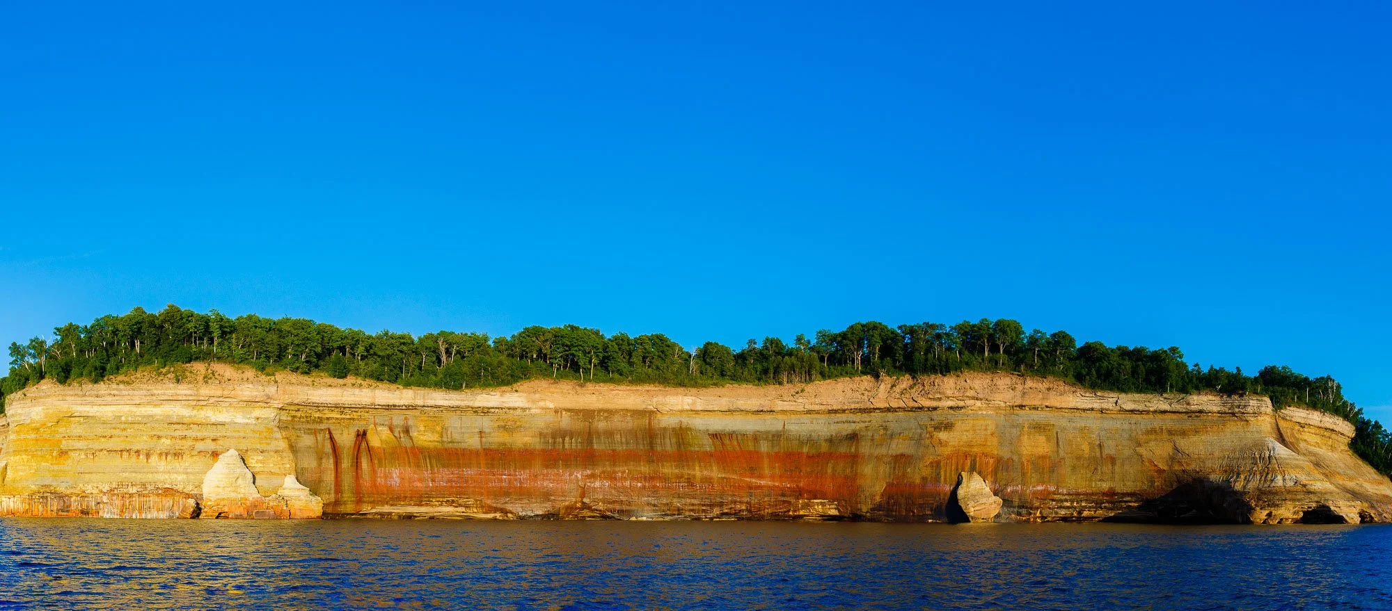 Cliffside landscape with layered rock formations, green trees on top, and calm water at the base under a bright blue sky. View fullsize