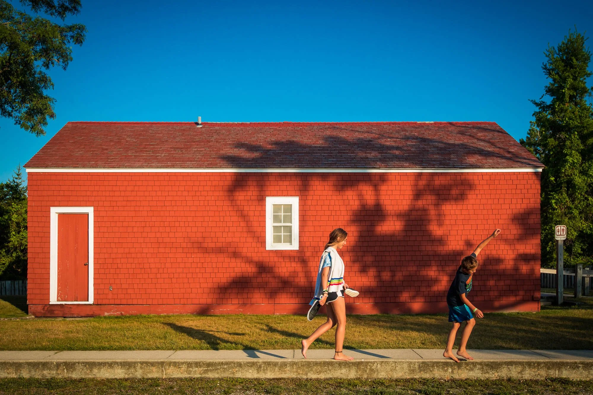 Two children walking on a sidewalk past a red-brick building with a white-framed window and door, with shadows of tree branches cast on the building during sunset. View fullsize